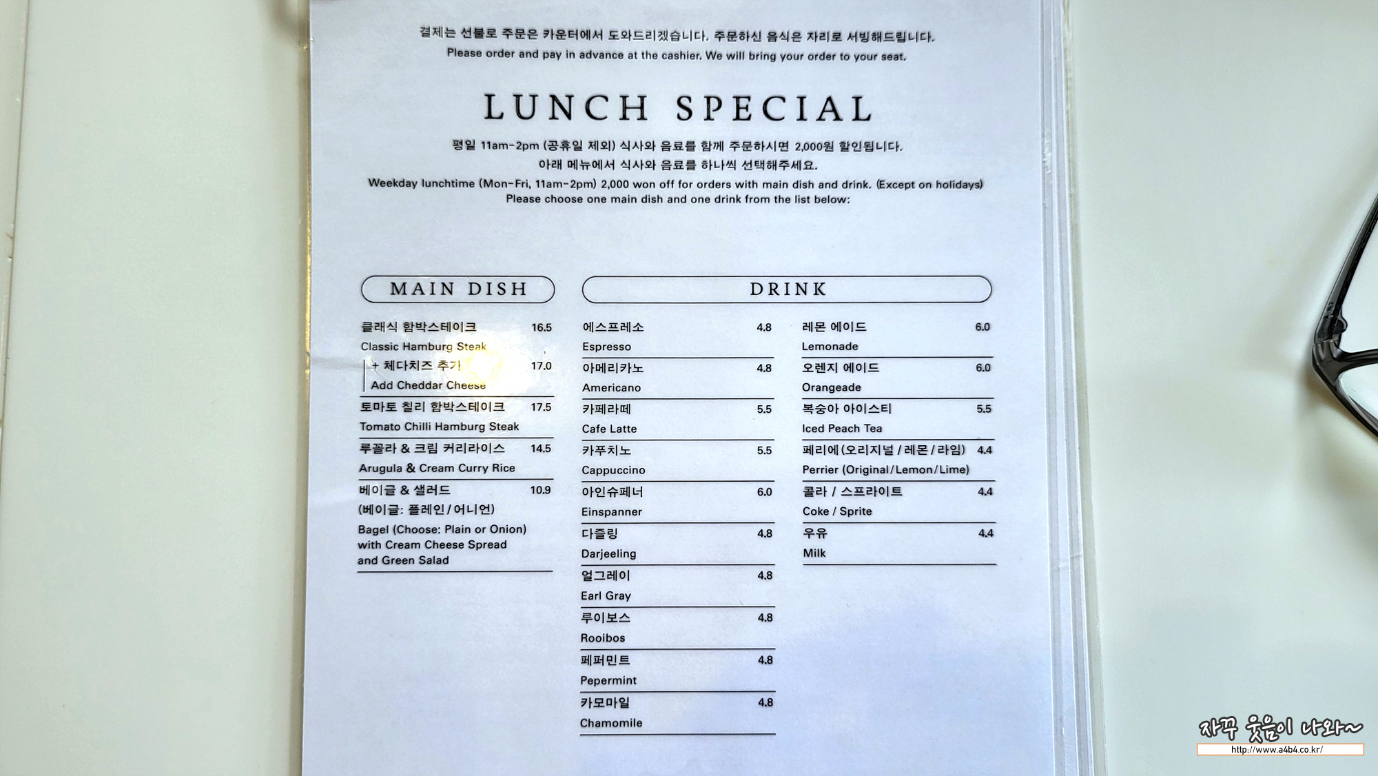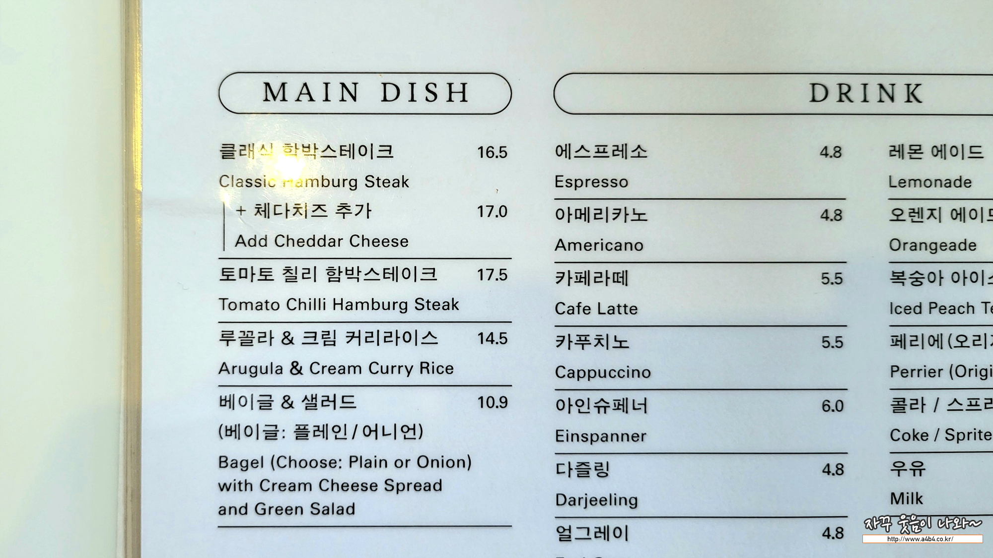음료 없이 함박스테이크 먹기는 다소 그렇네요. 그래서 음료도 주문하고 먹다 보니 스프도 생각나네요. 스프까지 주문하면 1인 금액은 약 25,000원 정도 생각하시면 됩니다.