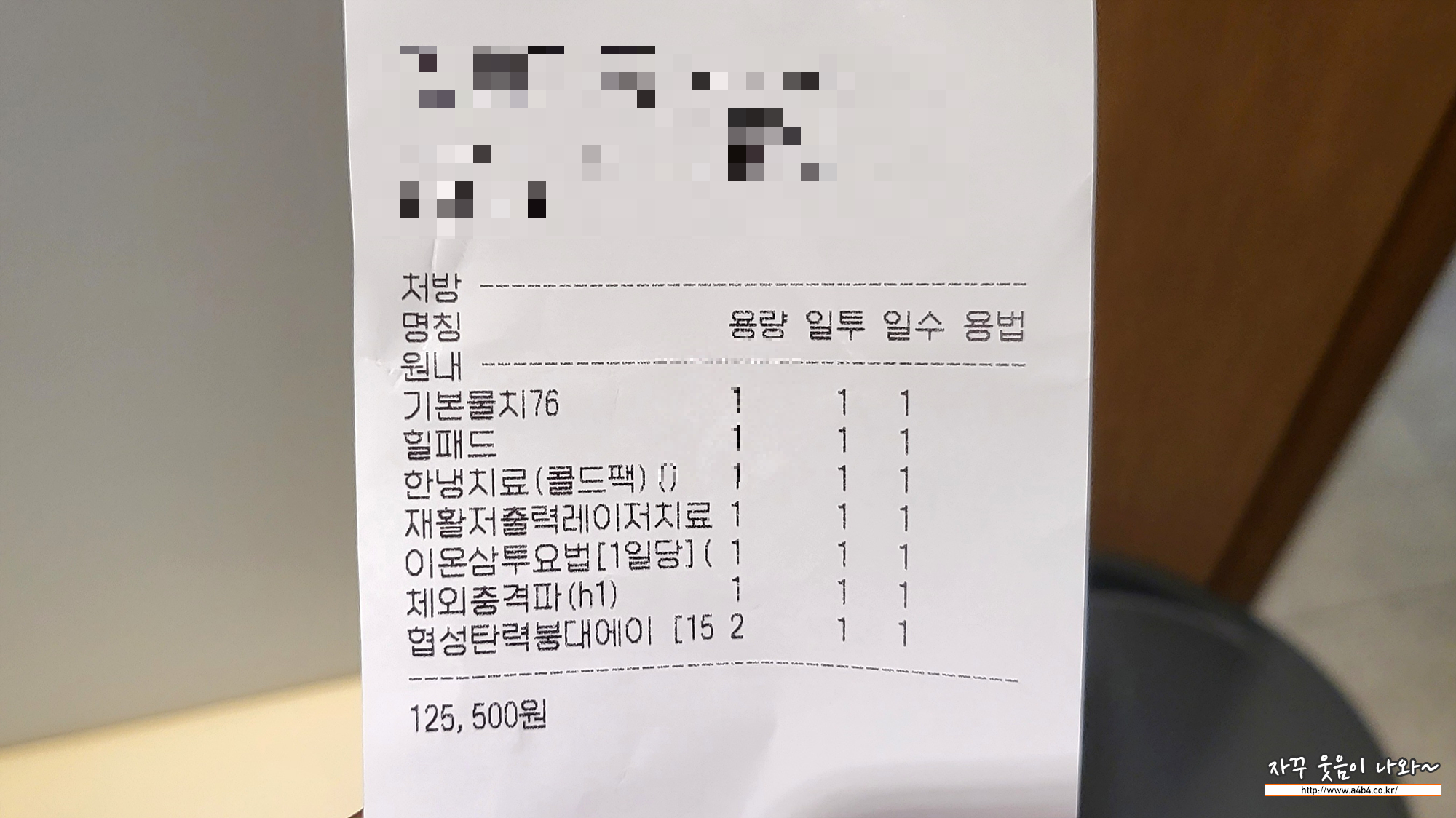 반깁스를 하고 정형외과에서 주 2회 물리치료를 받으라고 하시네요. 한 번에 물리치료 비용은 125,500원입니다. 나중에 골절관련 실손 보험에서 얼마나 돌려받을지 모르겠지만 한 달 꾸준히 치료만 해도 100만원 이상의 치료비가 나오네요.