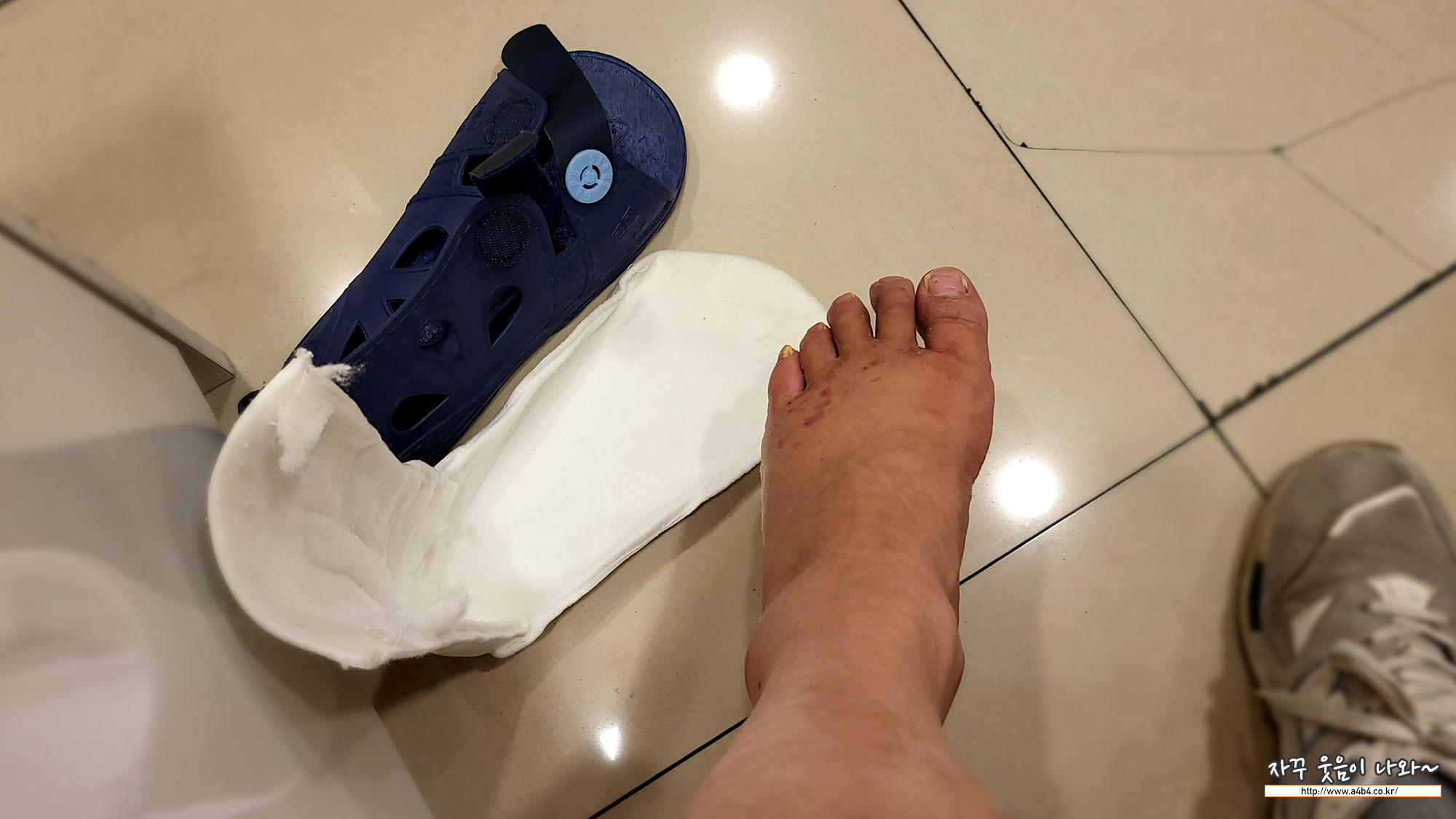 여름에 반깁스를 하니 그래도 저녁에 붕대를 풀고 발을 씻을 수 있어 통깁스 보다는 좋긴 하네요. 다만 발골절 초기에는 발이 너무 부어서 양말을 신지 못하고 깁스를 하다 보니, 땀이 차서 관리가 상당히 어렵네요.