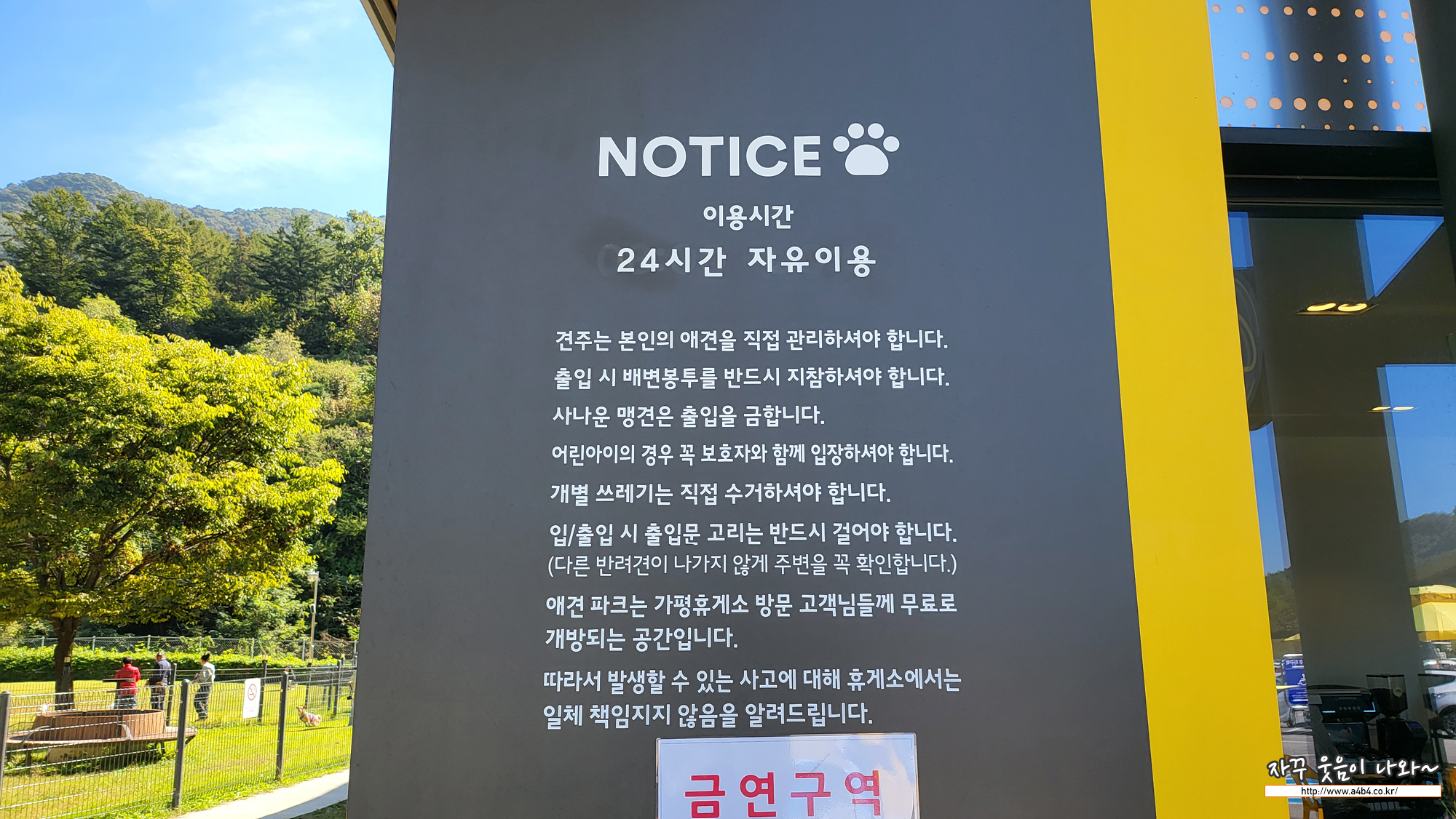 강아지 고속도로 휴게소인 양양고속도로 가평휴게소 옐로우스탑 이용방법입니다. 24시간 자유이용이며, 별도이 이용요금은 없습니다. 펫파크 내에 별도의 관리인이나 안내원은 없고요. 자율적으로 운영되는 곳입니다. 출입시 배변봉투 지참하셔야 하고요. 일반적인 펫파크와 이용방법은 동일합니다.