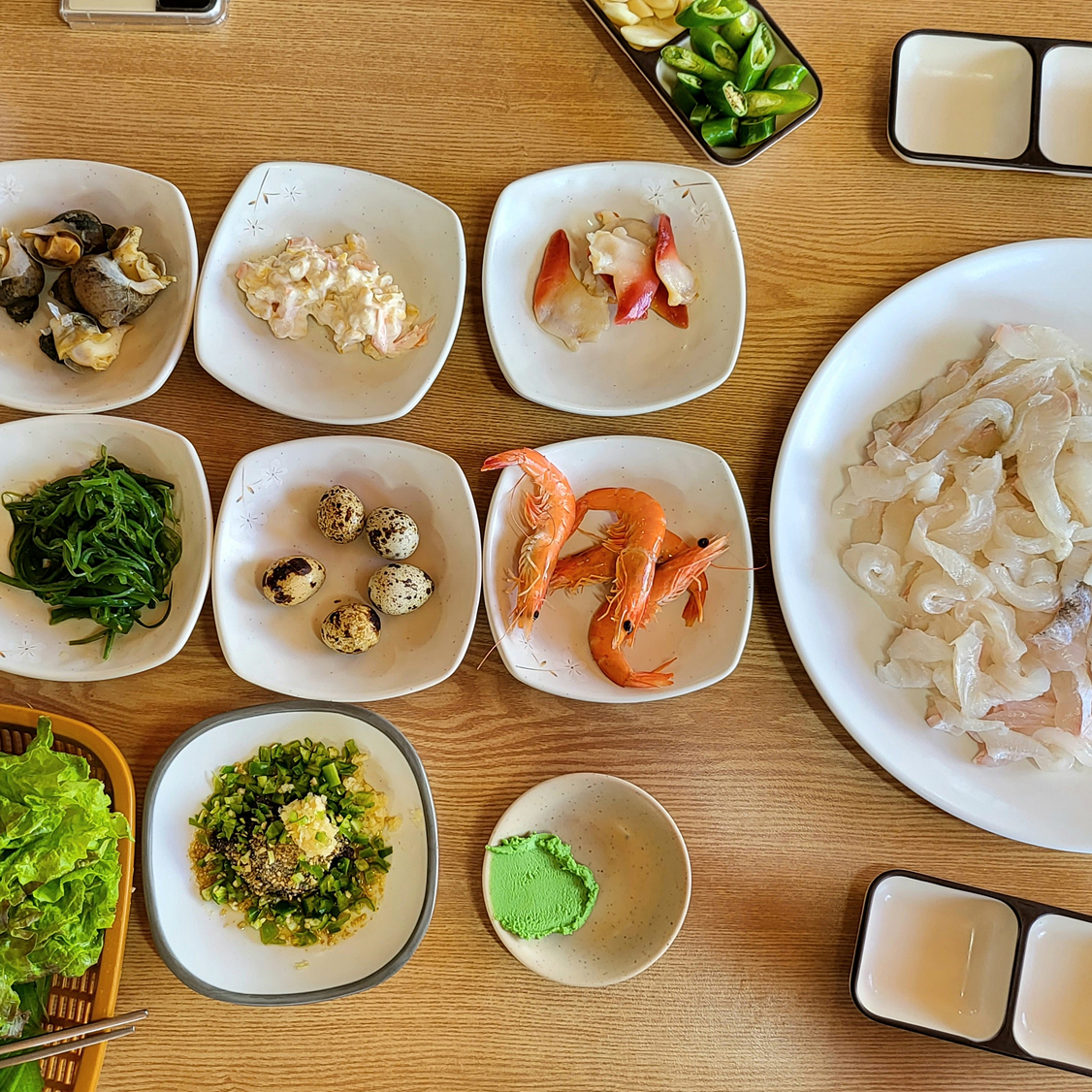 상추와 깻잎도 나왔지만, 역시나 회는 오직 초장과 고추냉이 간장과 함께하는 그 맛과 식감이 최고인 듯 합니다. 회도 부족하지 않고, 배부르게 잘 먹었네요.