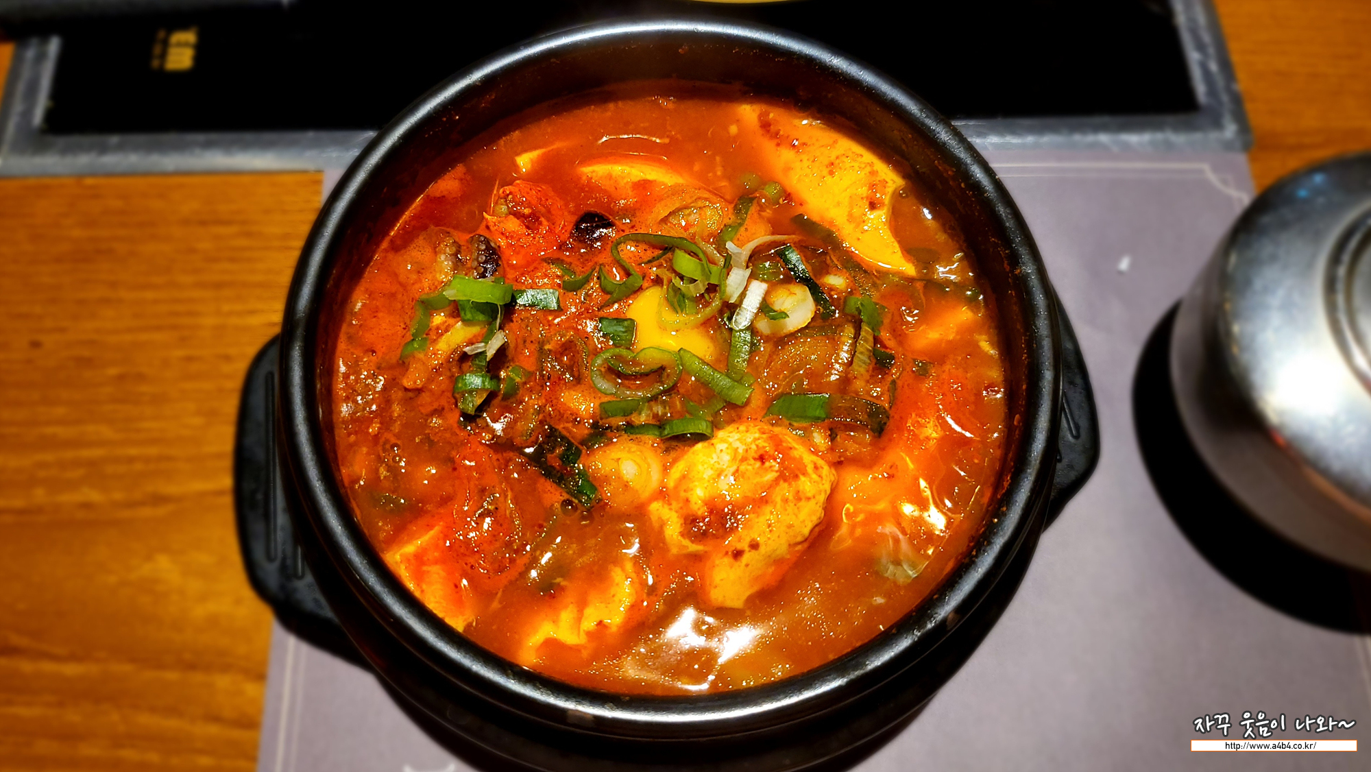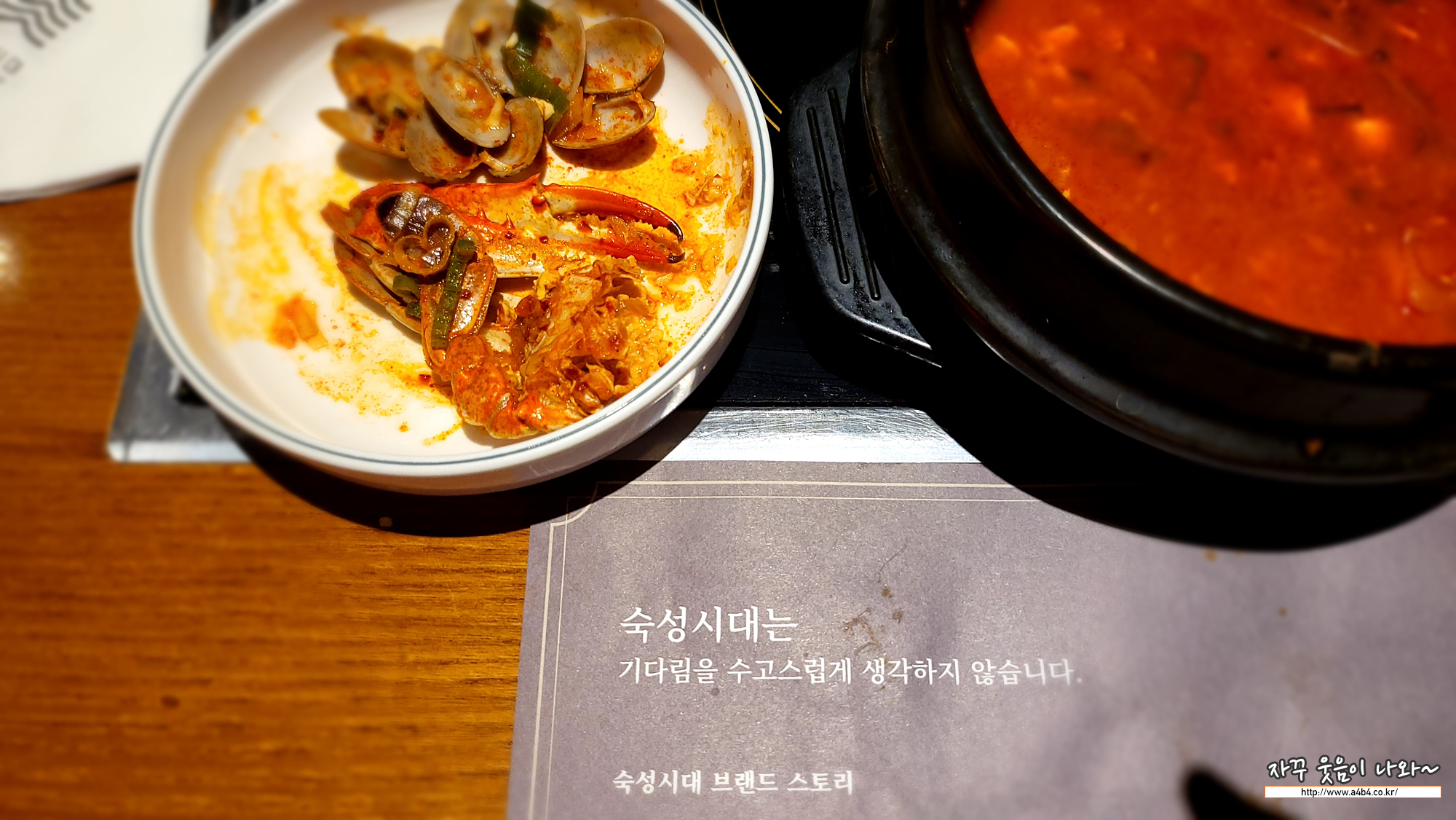 롯데월드몰 숙성시대 순두부는 제가 주문한 메뉴입니다. 작은 게 반마리와 바지락 조개, 새우들이 들어간 순두부찌개인데요. 다소 얼큰한 맛을 보입니다. 매운 음식을 선호하지 않는 분들에게는 추천 드리지 않지만, 역시나 순두부째개는 전문점에서 먹는 것을 추천 드리는 메뉴