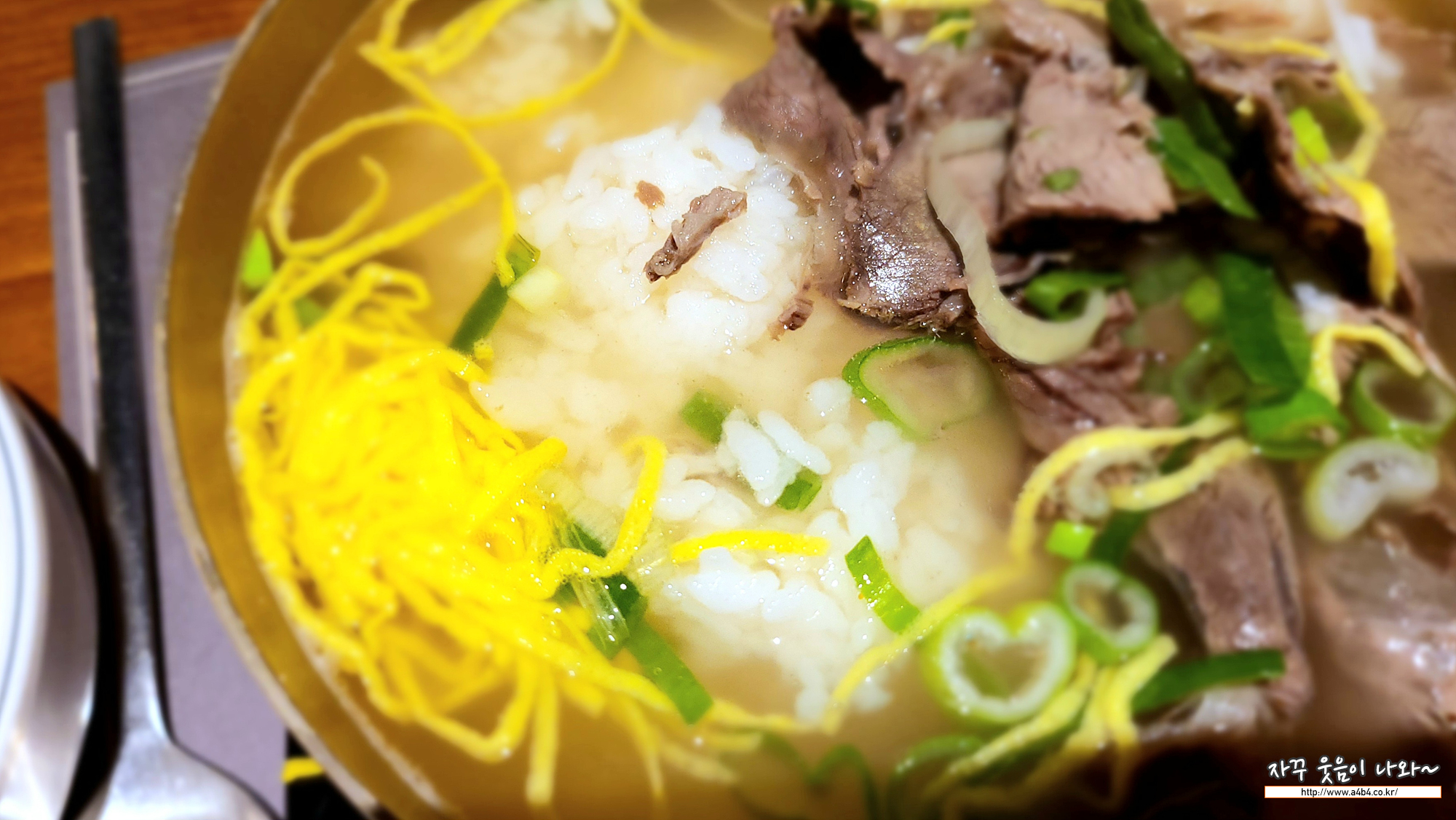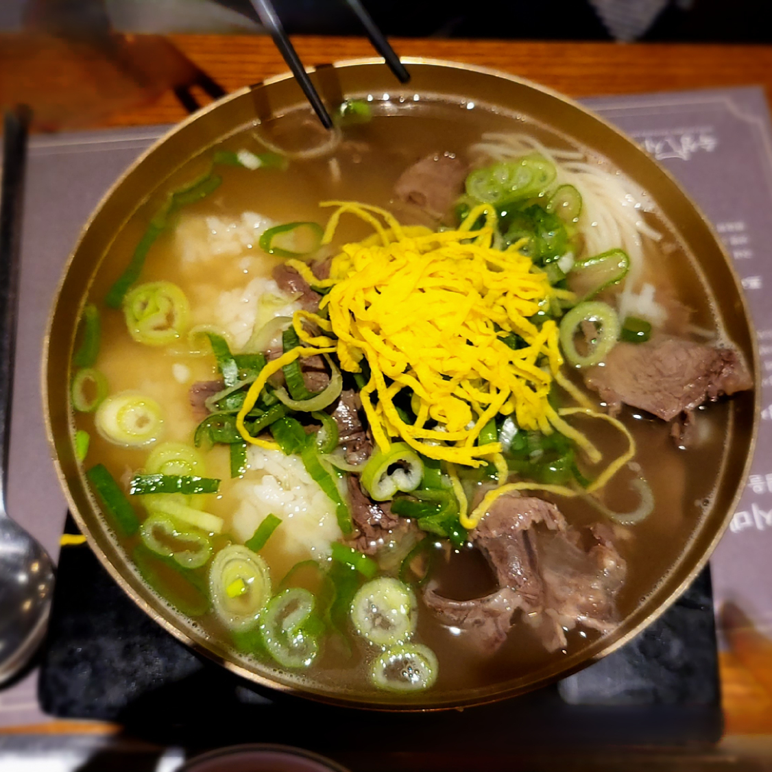 두껍고 무게감이 있는 놋그릇에 나오는 나주식 한우곰탕입니다. 이곳 숙성시대 롯데월드몰점의 대푠 식사메뉴이기도 합니다. 고기도 질기지 않고 많이 나오고요. 국물도 맑고 진한 맛을 보입니다.