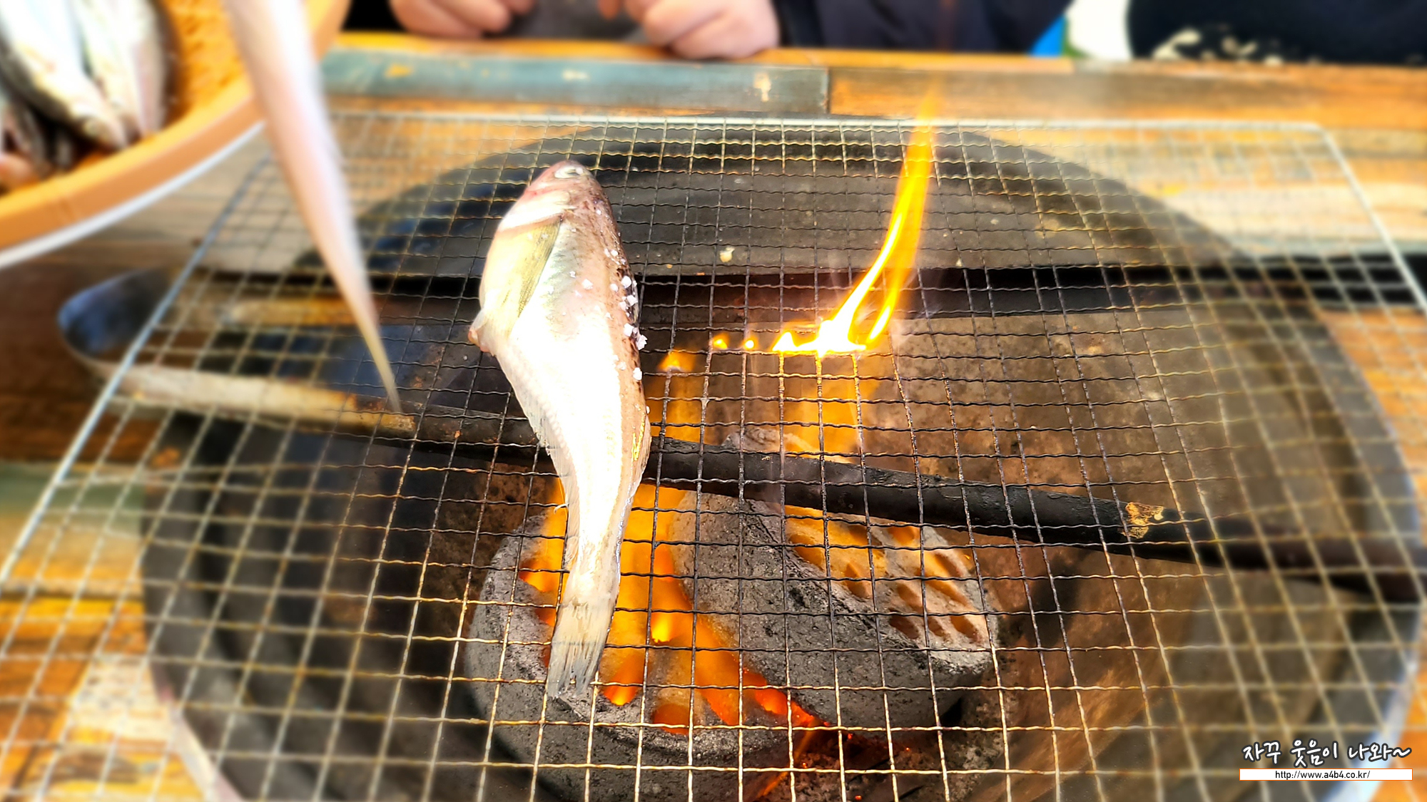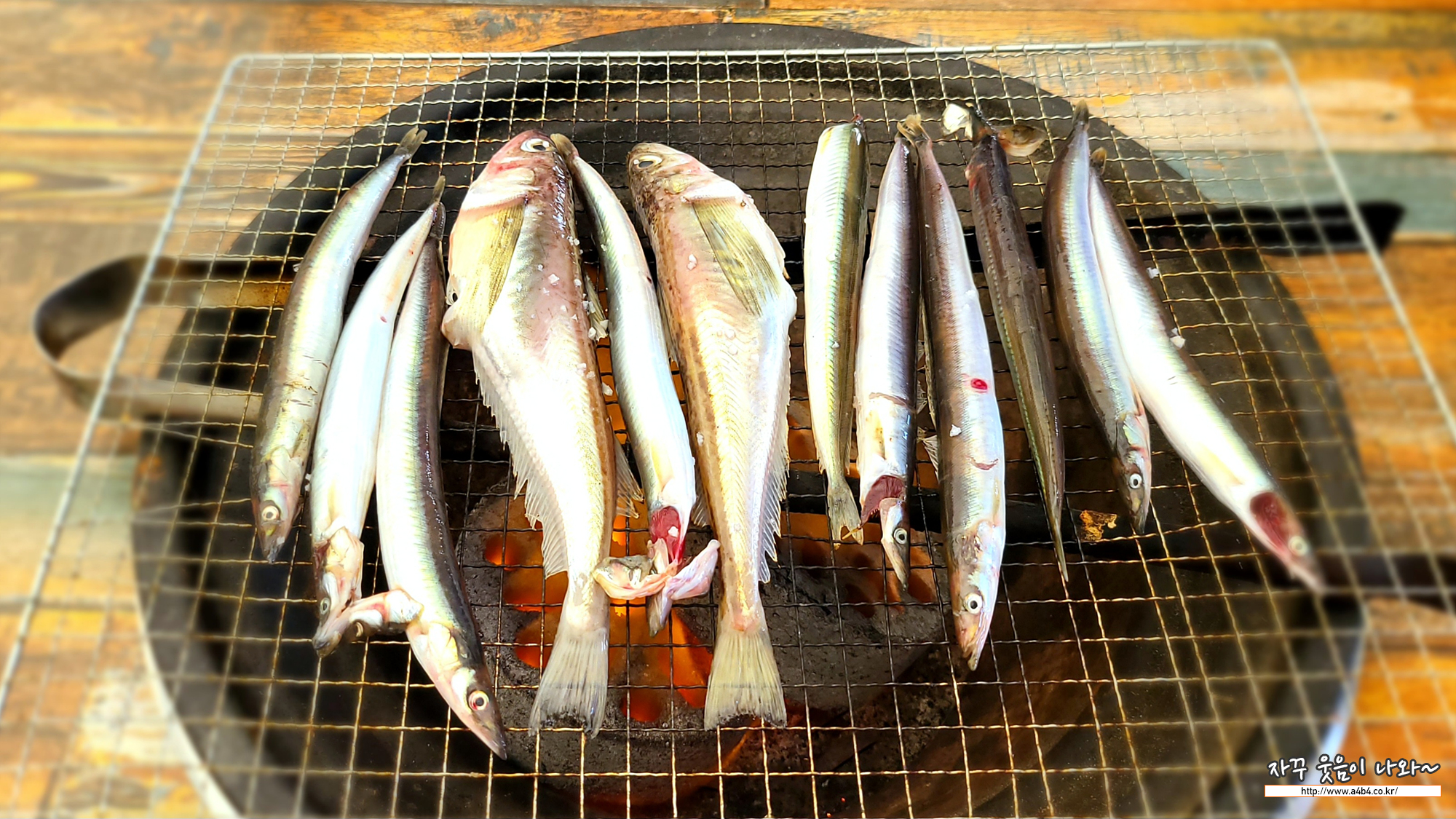 양미리와 도루묵 구이 주문합니다. 가자미 세 조각은 서비스로 나왔고요. 바구니 사진은 이미 한 판 불위에 올려놓고 찍은 사진이네요.