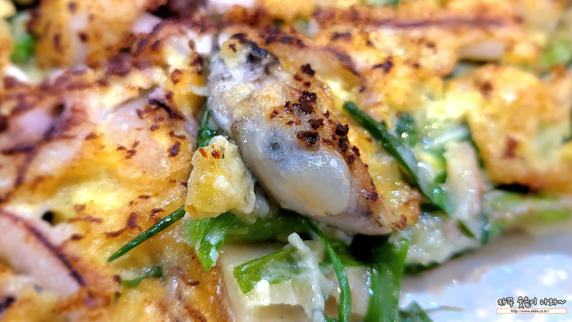 해물파전에는 굴과 오징어, 새우가 메인으로 들어가 있습니다. 바삭하게 잘 구어서 나왔네요.
