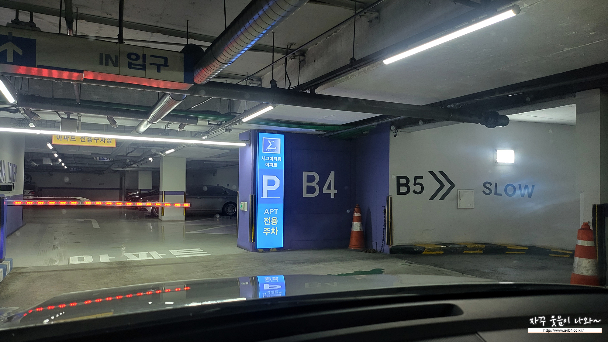 그 좁고 위험한 주차장을 내려가면서 가장 짜증나는 부분 중 하나였는데요. 이 험난한 코너를 지하 5층까지 돌아돌아 내려가야 합니다. 4층까지는 시그마타워 아파트 전용 주차장이고 지하 5층부터 상업용 건물 주차장으로 되어 있네요. 보통은 각 층에 주거공간과 상업공간이 분리되어 운영되는데, 주차장 난이도도 높고. 재방문 의사 없어졌네요.
