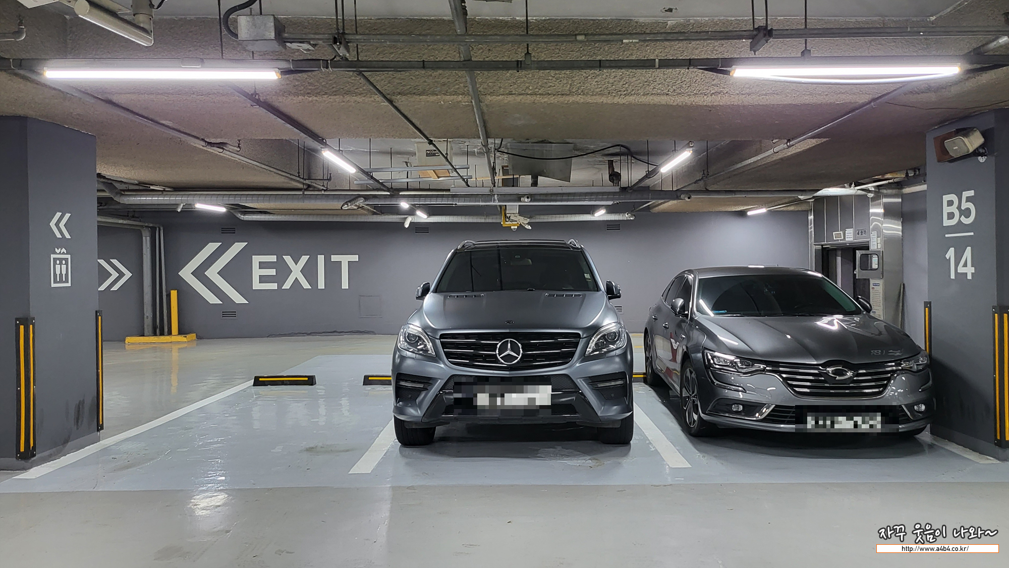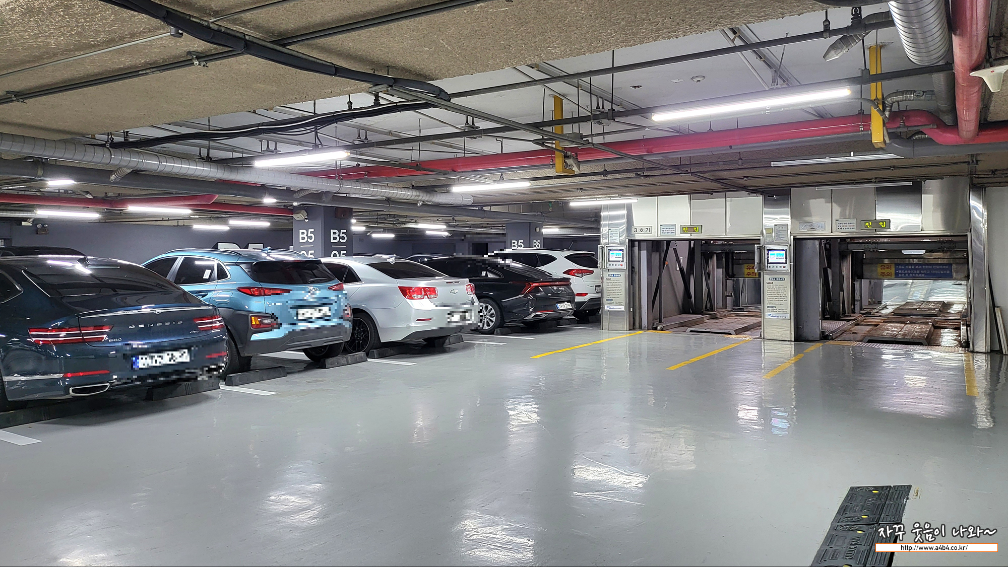 이 안에 주차 엘리베이터가 또 있네요. 그리고 주차장 차간 공간은 여유있지 않습니다. 그냥 빡빡한 차간 간격 보여줍니다.