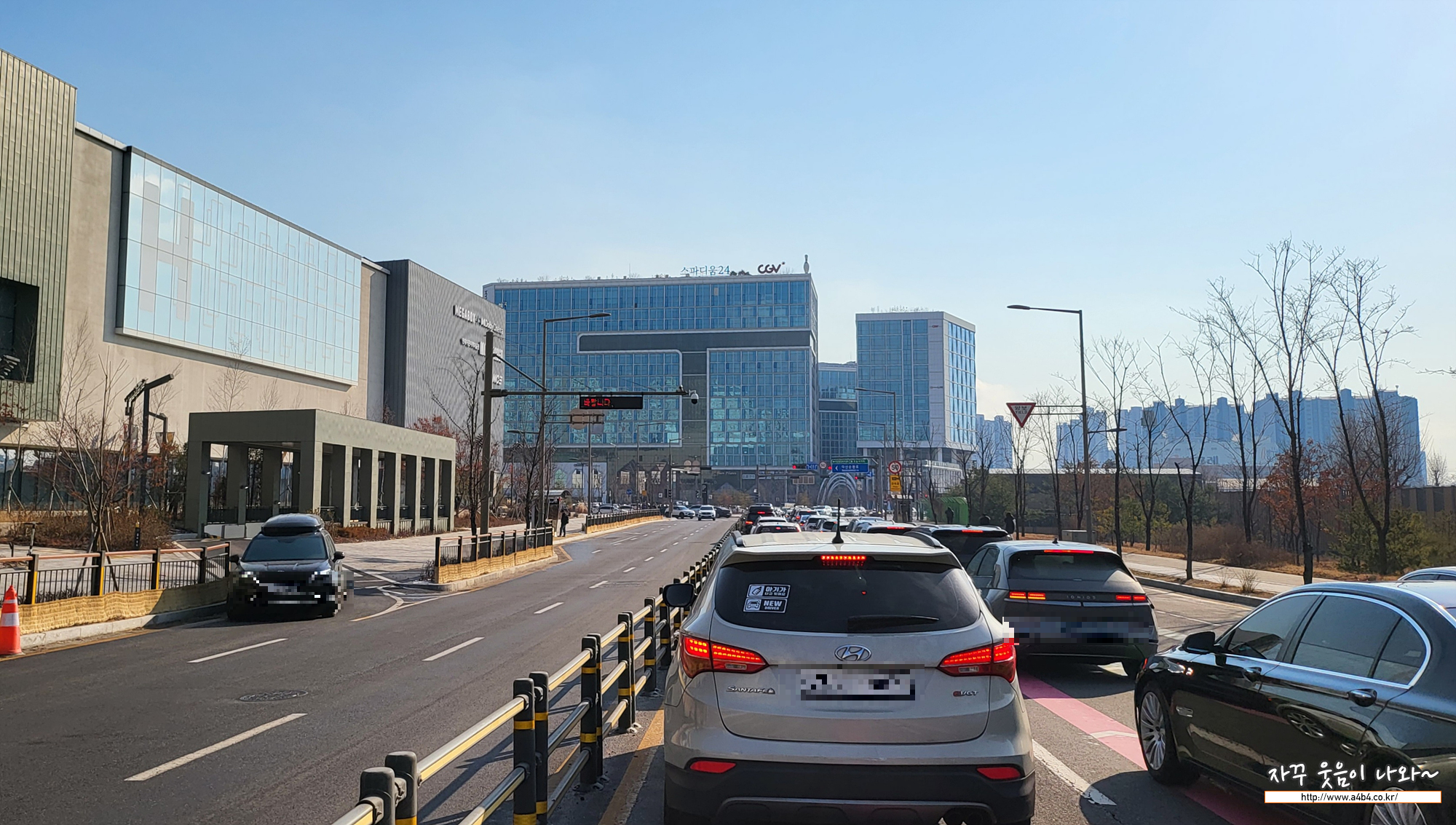 바로 이 다산신도시 현대 프리미엄 아울렛 스페이스원 앞에서 차가 움직이지 않습니다. 안내원분께서 들고 있으신 펫말에는 여기서부터 20분이 더 소요된다고 하네요.