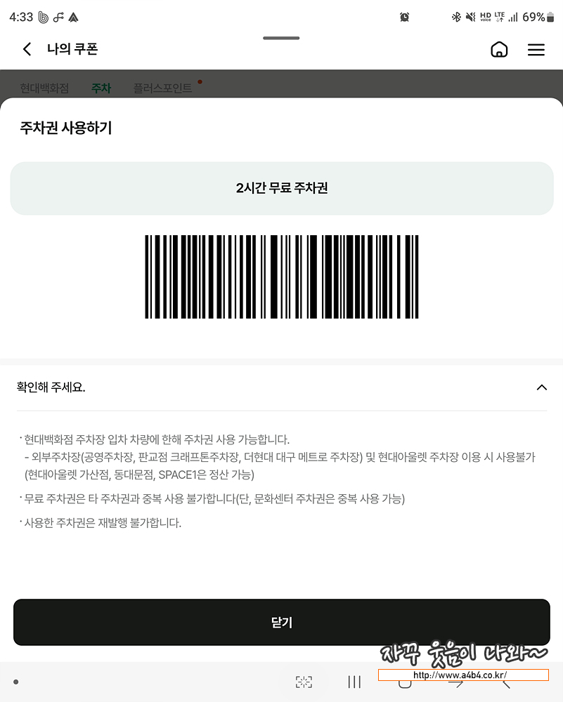 또한 현대백화점 통합앱이 있으면 2시간 무료 주차권을 사용할 수 있습니다.