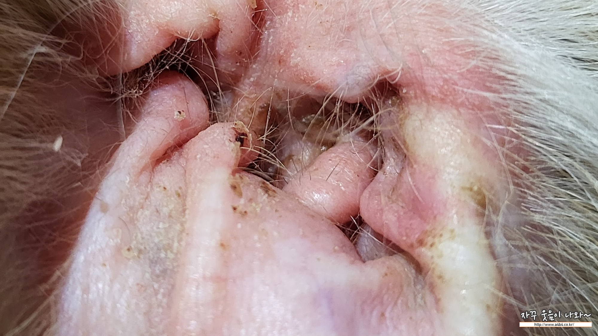 위는 강아지 왼쪽귀입니다. 귓속에 노란색 검정색 분비물들이 말라서 붙어 있습니다. 아래 정상적인 오른쪽 귓속과 비교해보시면 차이를 느끼실 수 있습니다.