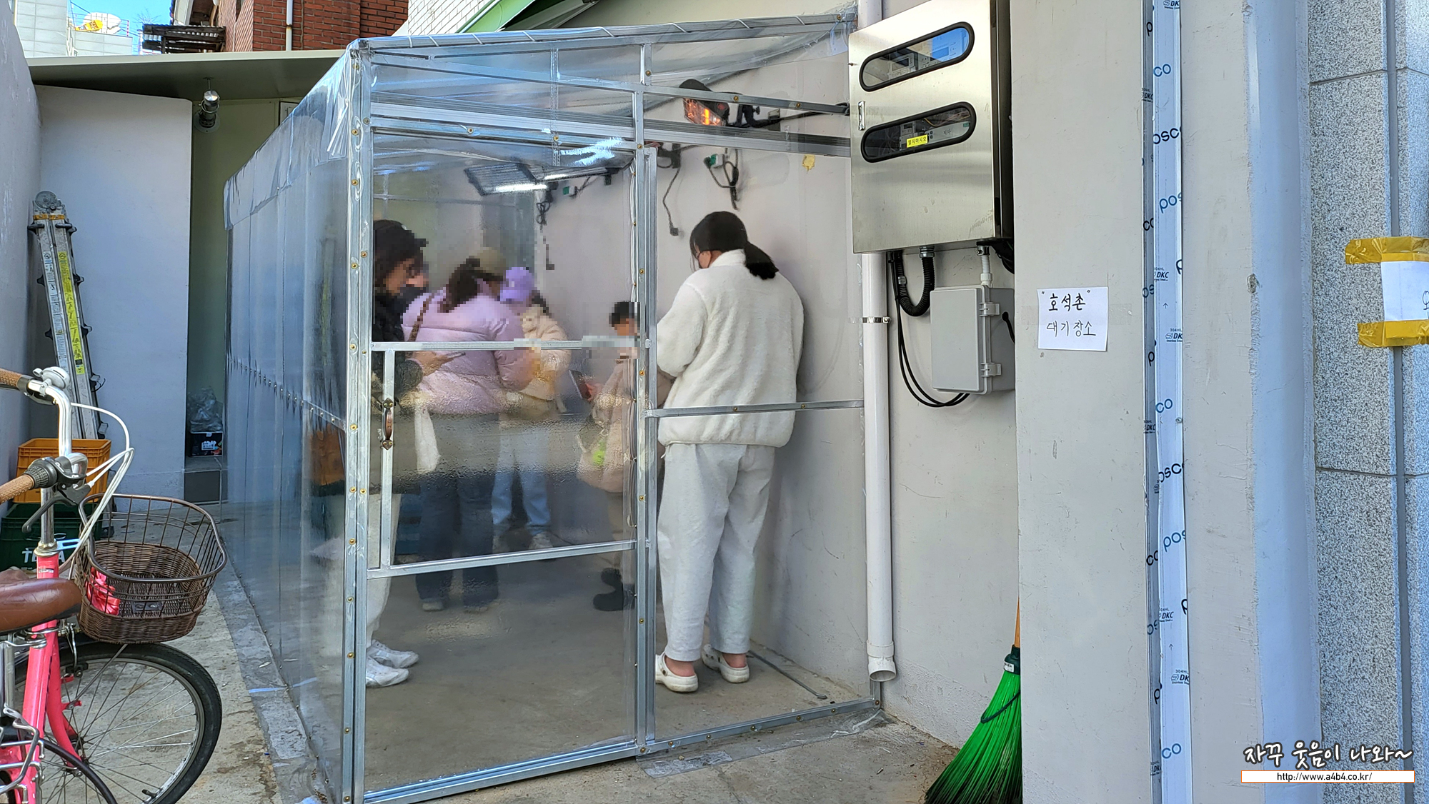 별도 대기손님을 위한 시설은 상당히 협소합니다. 위 사진의 비닐로 만들어진 공간이 유일한 대기공간 입니다. 의자는 없고요 서서 한 시간 이상 대기해야 합니다. 이곳에서 들어가지 못하신 분들은 건물 주변에서 추위와 싸우면서 긴 시간 대기하셔야 합니다. 호석촌 빠른 입장을 위해서는 무조건 예약하시고 생각하세요.