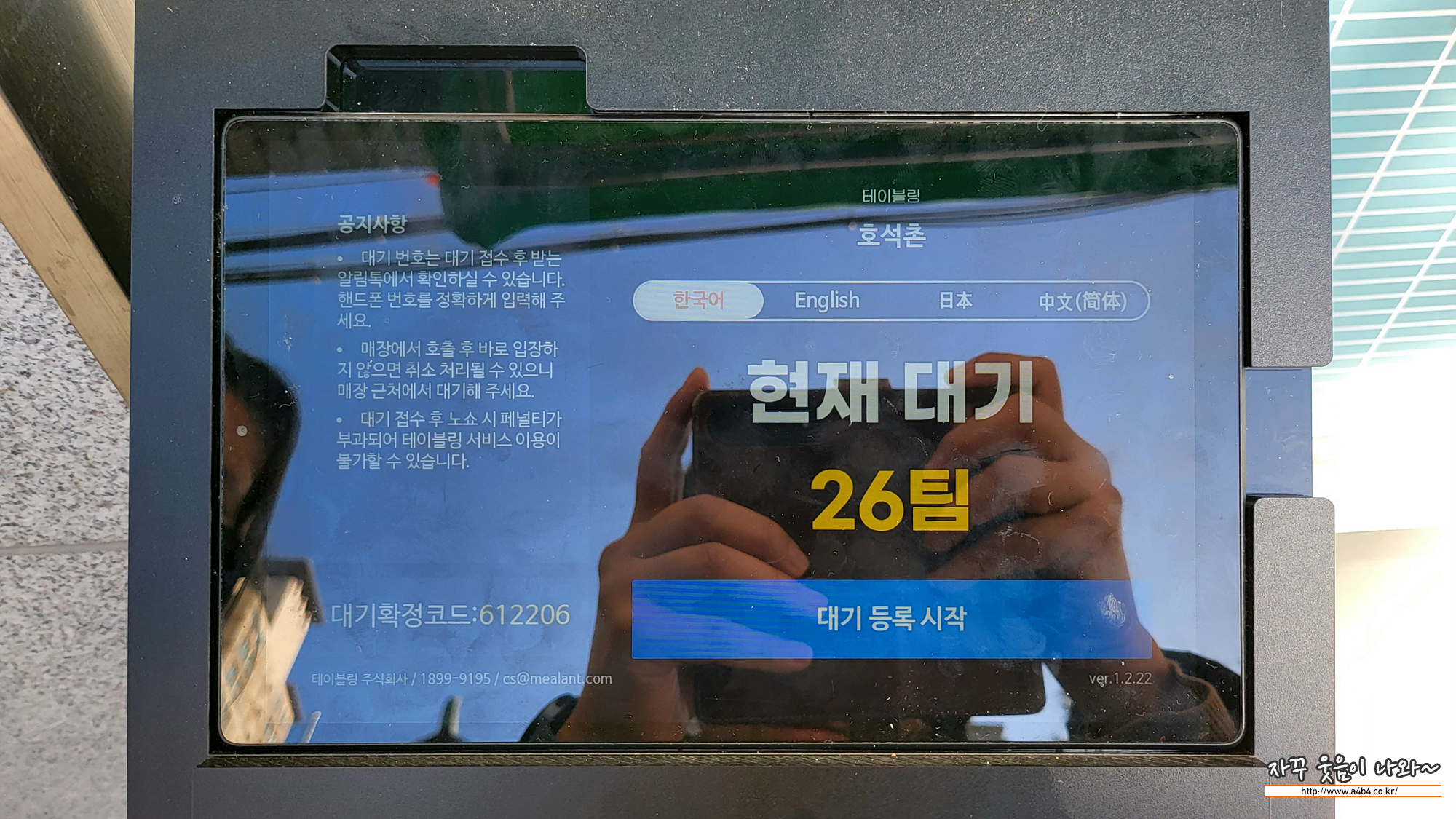 호석촌은 현장에서 태블릿을 통해 예약을 받는데요. 테이블링 앱에서 보면 현재 대기중인 팀 확인이 가능합니다. 보통 20팀 정도 있으면 한 시간 대기가 걸리네요. 대기 인원이 너무 많다면, 다음에 방문하시길 추천 드립니다.