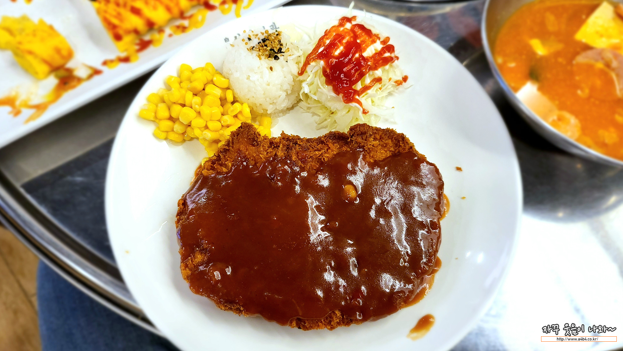 돈까스와 작은 밥, 옥수수, 양배추와 캐쳡이... 구성은 옛날 돈까스 모양을 보이는데요.