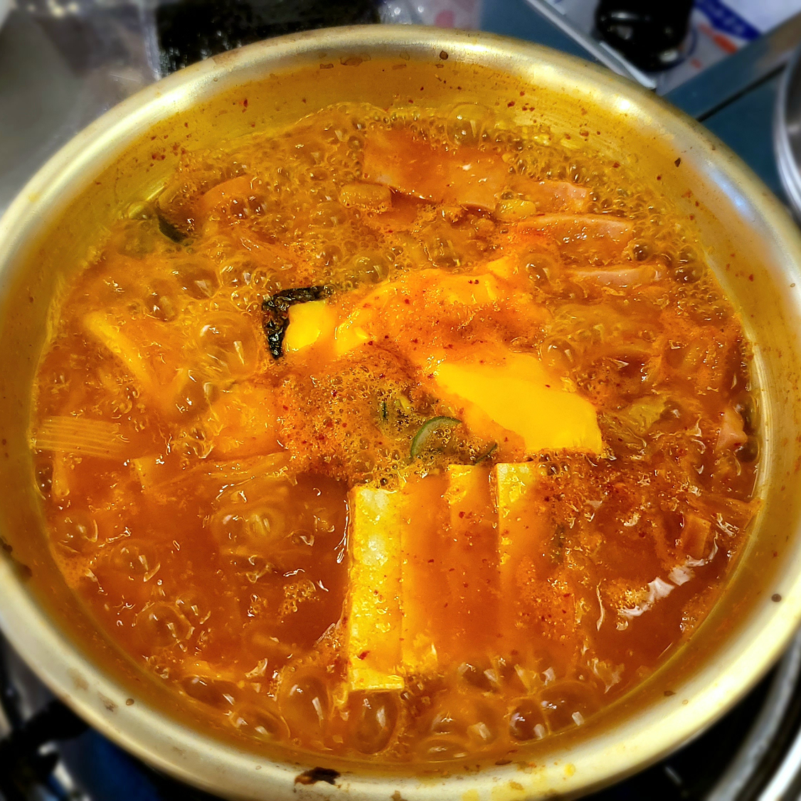 기본 내용물은 두부와 다양한 모듬햄, 김치가 들어 있습니다. 이외에 콩 등 부대찌개에서 맛볼 수 있는 내용물들을 만나볼 수 있습니다. 다만 아쉬웠던 부분은 칼국수사리, 수제비사리, 라면사리 등 여러 사리가 추가되는데, 이중 하나 이상의 사리를 주문하지 않은 부분은 아쉬웠네요. (직원 분 한 번 물어봐 주시지...)