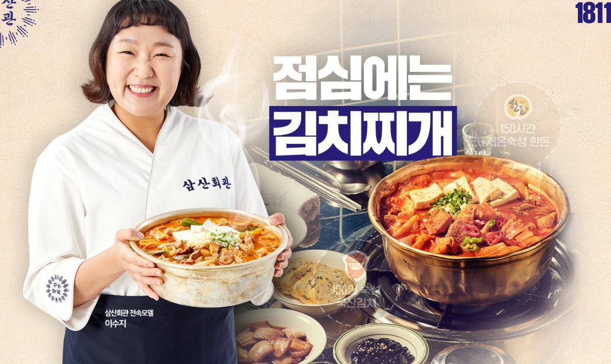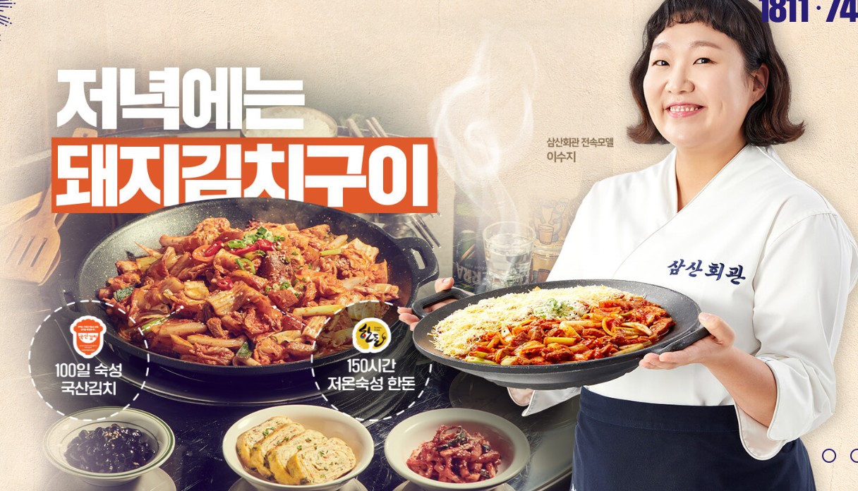 오늘 소개하는 삼산회관은 연예인 이수지씨가 모델로 활동하고 있는 프랜차이즈 식당입니다. 점심에는 김치찌개나 돈까스, 냉면 등 1만원 미만의 단품 식사가, 저녁에는 돼지김치구이를 메인의로 몇 가지 사이드 메뉴와 함께 술 한 잔 하기 좋은 구성을 보여주는 곳입니다.