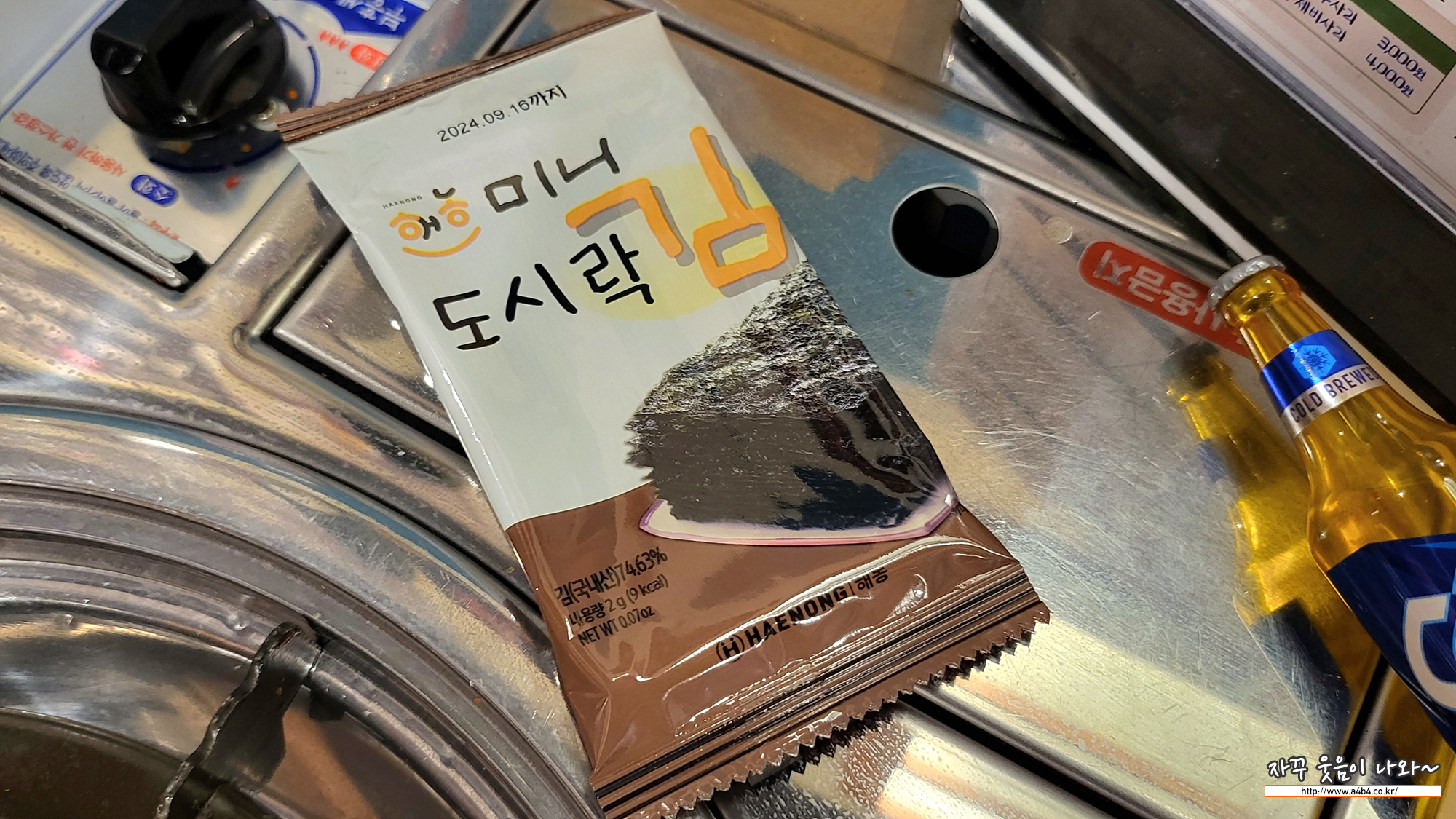테이블에 미리 세팅되어 있는 종이컵과 포장김 '미니 도시락김'이 있네요. 이녀석은 어떤 메뉴와 잘 어울릴지...