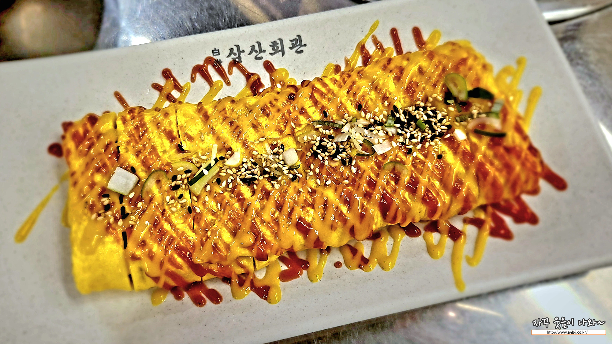 삼산회관에서 가장 먼저 주문한 메뉴가 바로 옛날계란말이입니다. 계란말이나 계란찜은 고깃집에서 항상 잘 어울리는 메뉴인데요. 이름은 옛날계란말이 이지만, 소스는 옛날 소스는 아니네요. 허니머스타드 소스와 토마토케첩이 격자로 모양내어 올라가 있습니다.