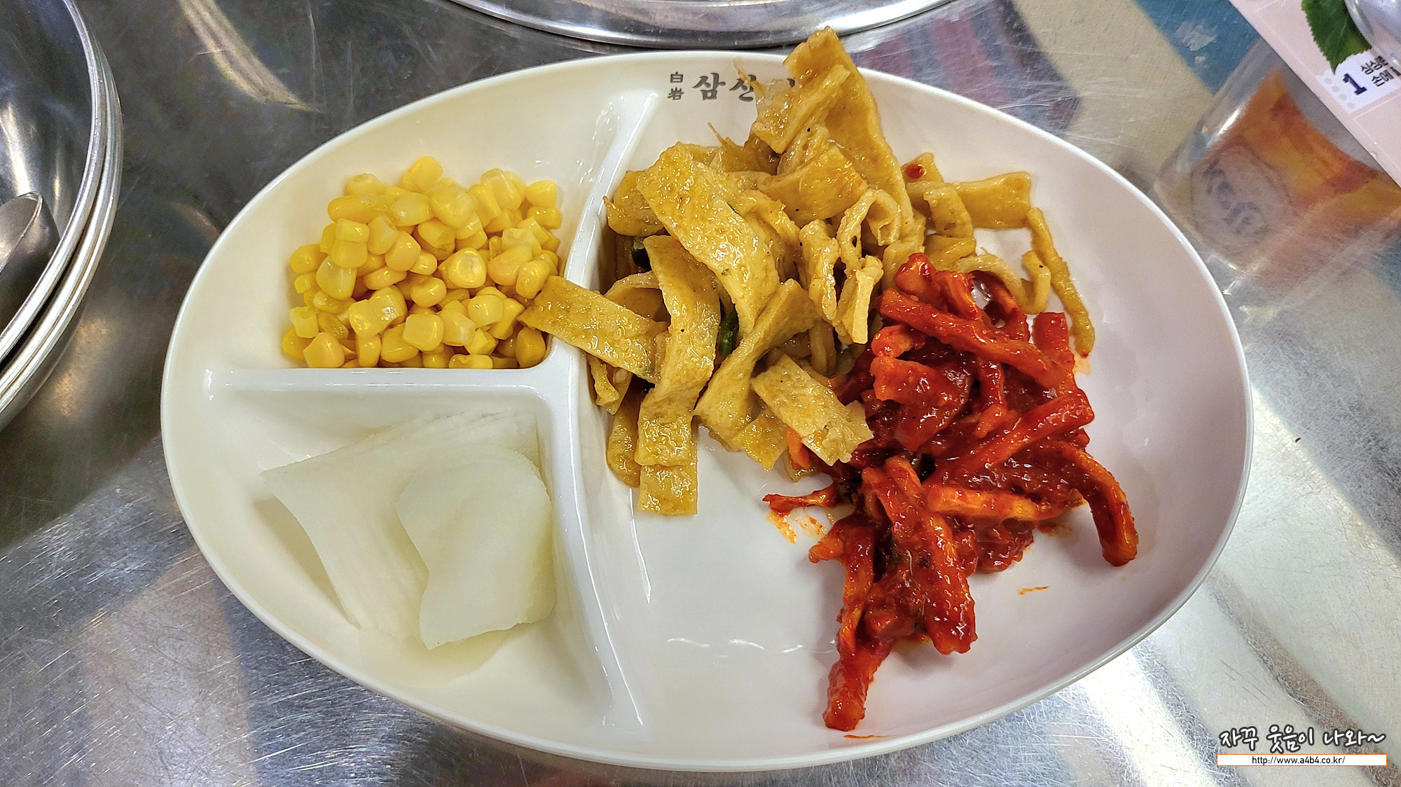 삼산회관은 반찬과 물, 냅킨은 셀프로 운영되고 있습니다.어묵과 무절임, 양상추와 무말랭이, 옥수수, 깻잎이 반찬으로 제공되고요. 쌈장과 소스 등이 준비되어 있습니다.
