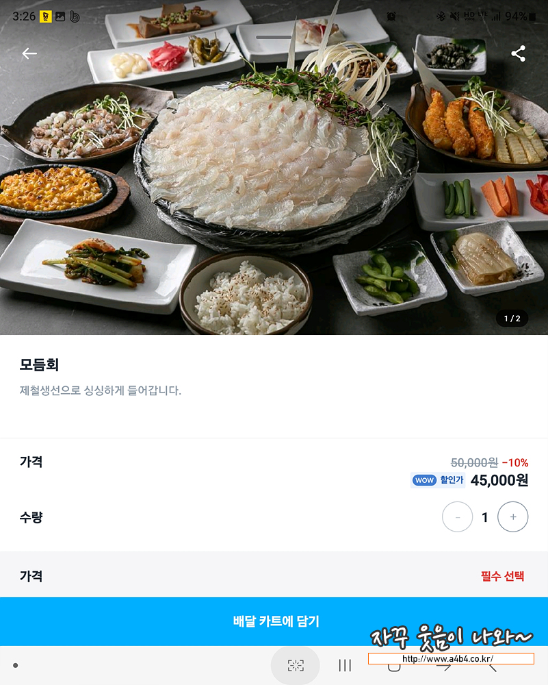 사진의 회가 독도앞바다 모듬회 작은사이즈입니다. 매장 가격은 50,000원 쿠팡이츠에서는 10% 할인된 가격은 45,000원에 주문가능합니다. 물론 한집배달 기준 3,000원 배달비 추가됩니다만...