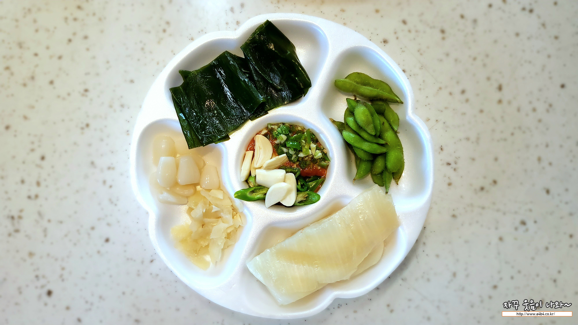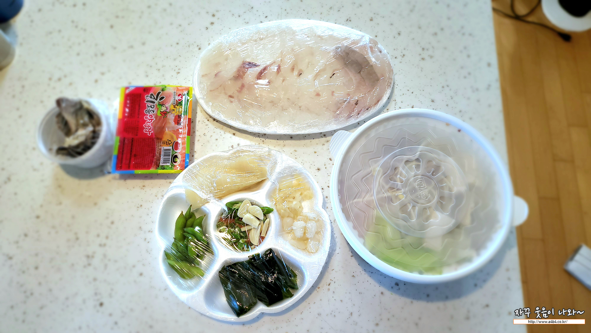 저희는 독도앞바다 모듬회 소자 주문합니다. 회 한접시와 락교와 미역줄기 등 몇몇 찬거리, 그리고 석화가 포장되었습니다.