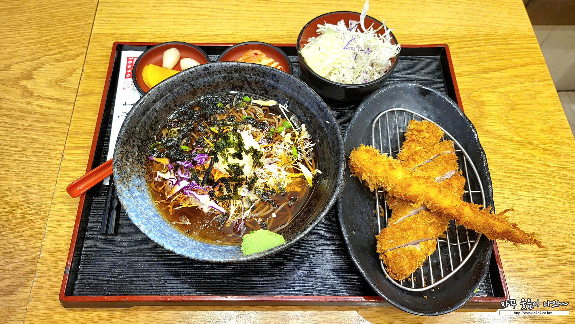 돈까스 한 덩어리와 새우튀김, 그리고 냉모밀로 조합된 정식입니다.