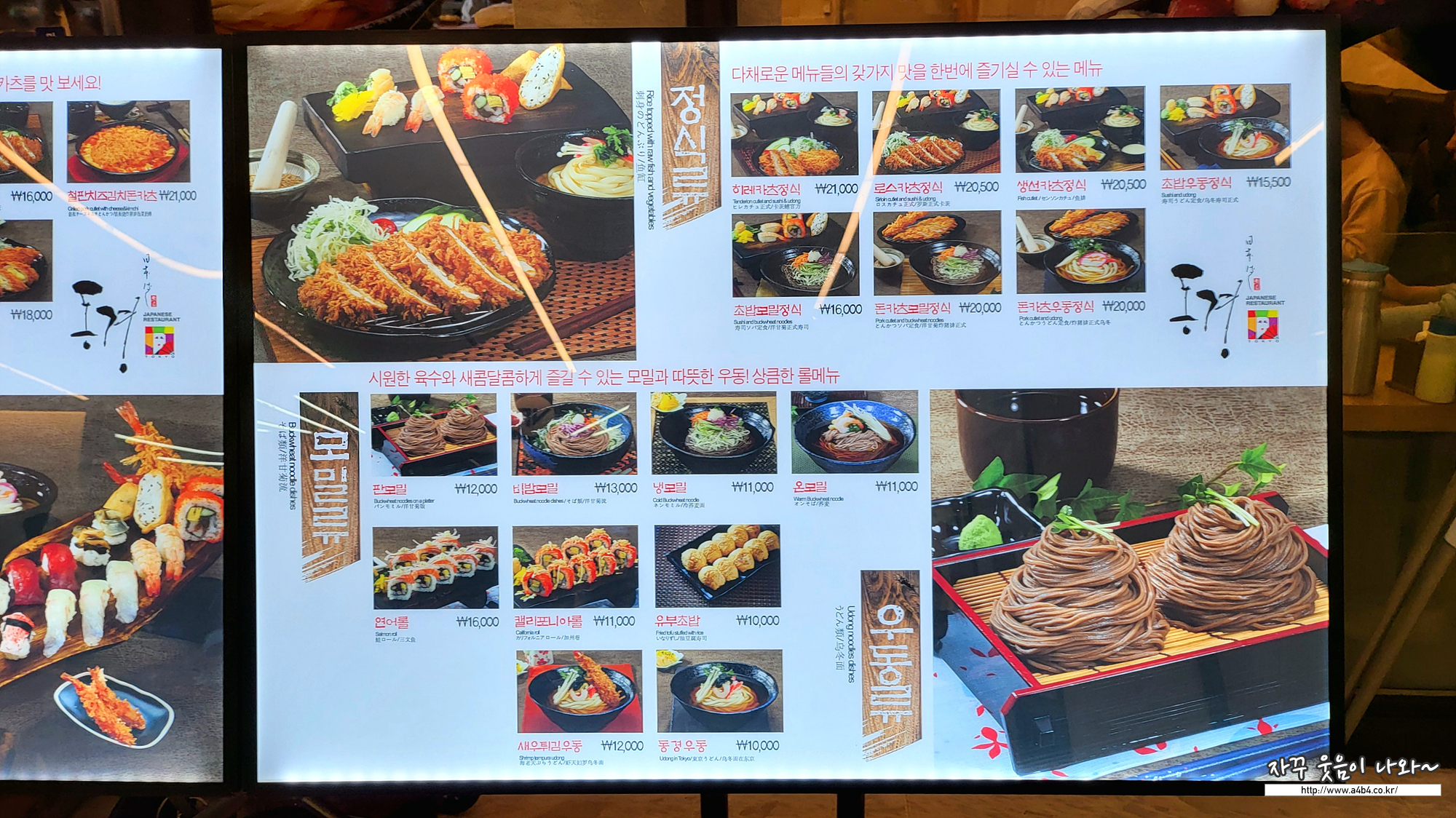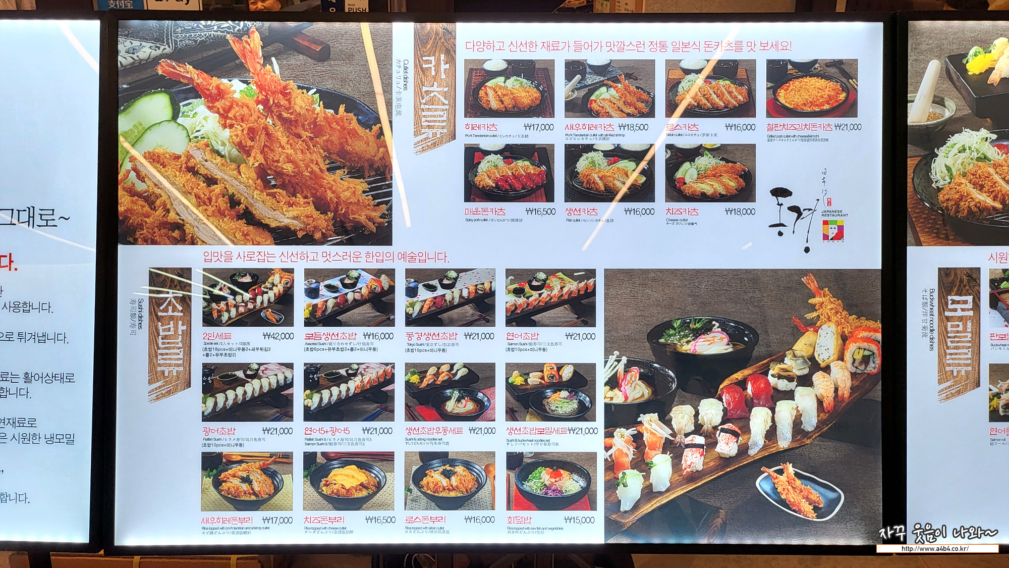 카츠류 가격은 1만원 후반대, 초밥류는 2만우너 초반 가격을 보입니다. 돈부리는 1만원 중반가격을, 모말과 우동은 1만원 초반 가격을 보입니다. 정식은 2만원 전후... 요즘 물가가 이렇게 올랐나요?