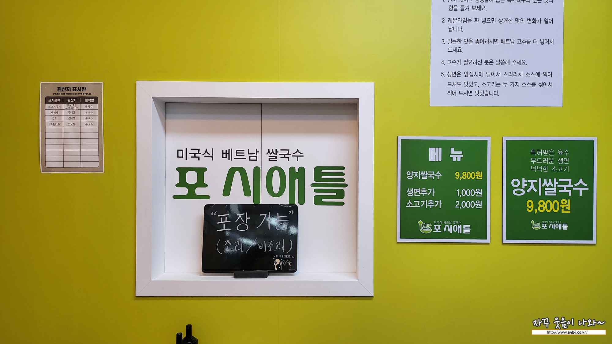 매뉴는 양지쌀국수 딱 하나입니다. 여름에는 서리태쌀콩국수를 판매하는 다소 이상한 미국식 베트남쌀국수 전문점이지만 메뉴는 오직 쌀국수 하나입니다. 포시애틀 쌀국수 가격은 9,800원으로 가격은 매우 착한...