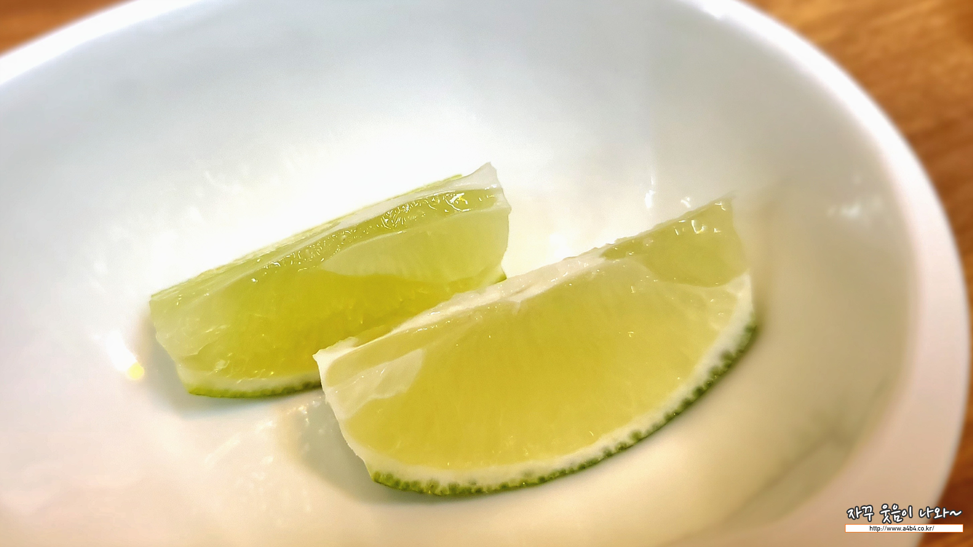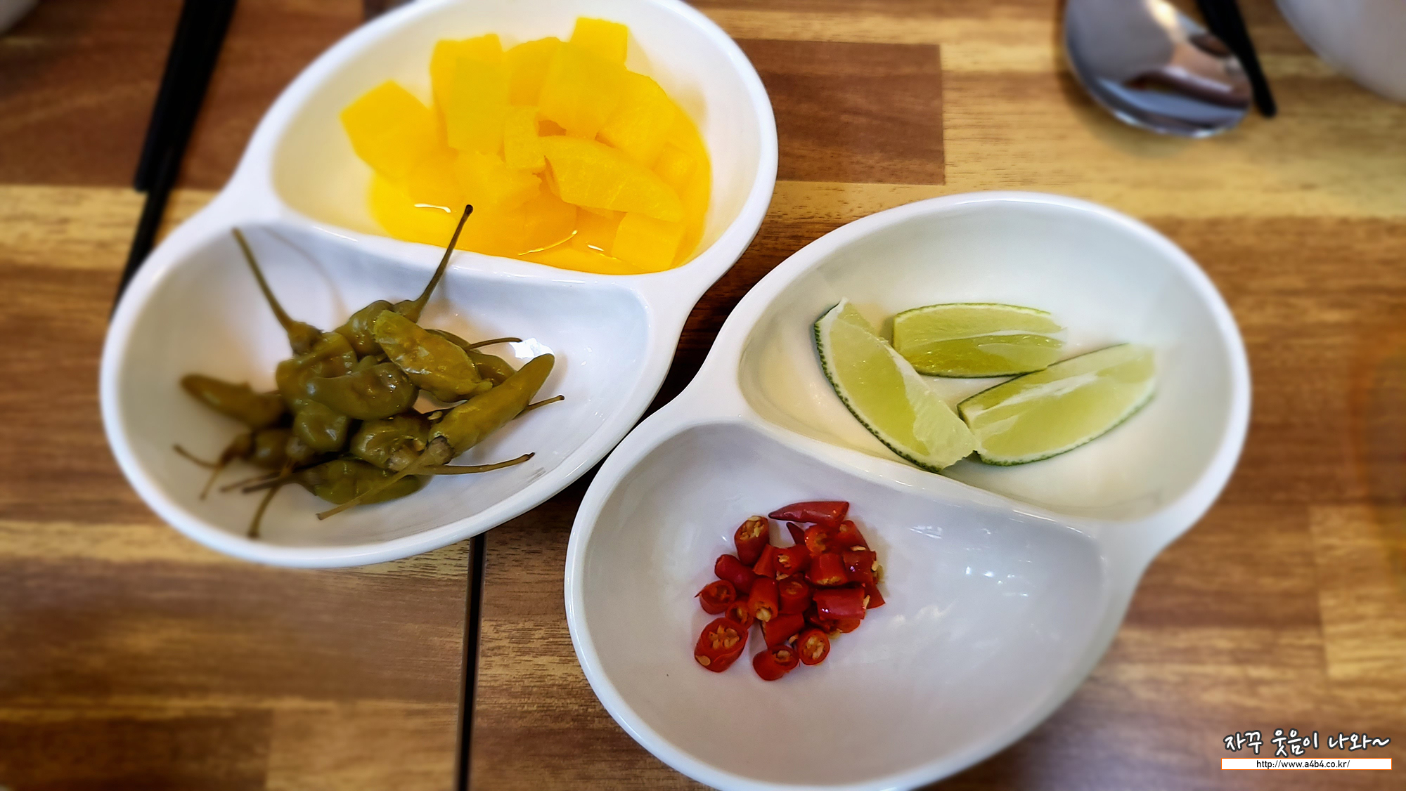 주문 들어가면 반찬 먼저 나오고요. 단무지와 할라피뇨. 라임과 매운고추가 나옵니다. 반찬은 리필 가능합니다.