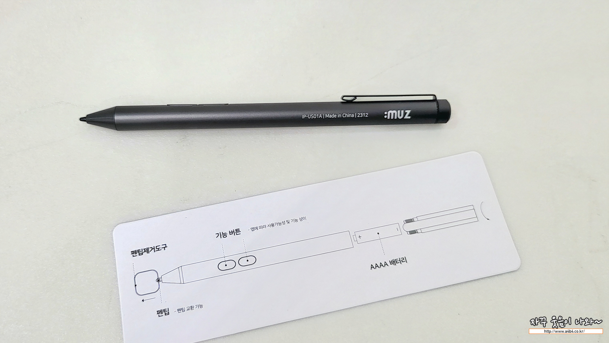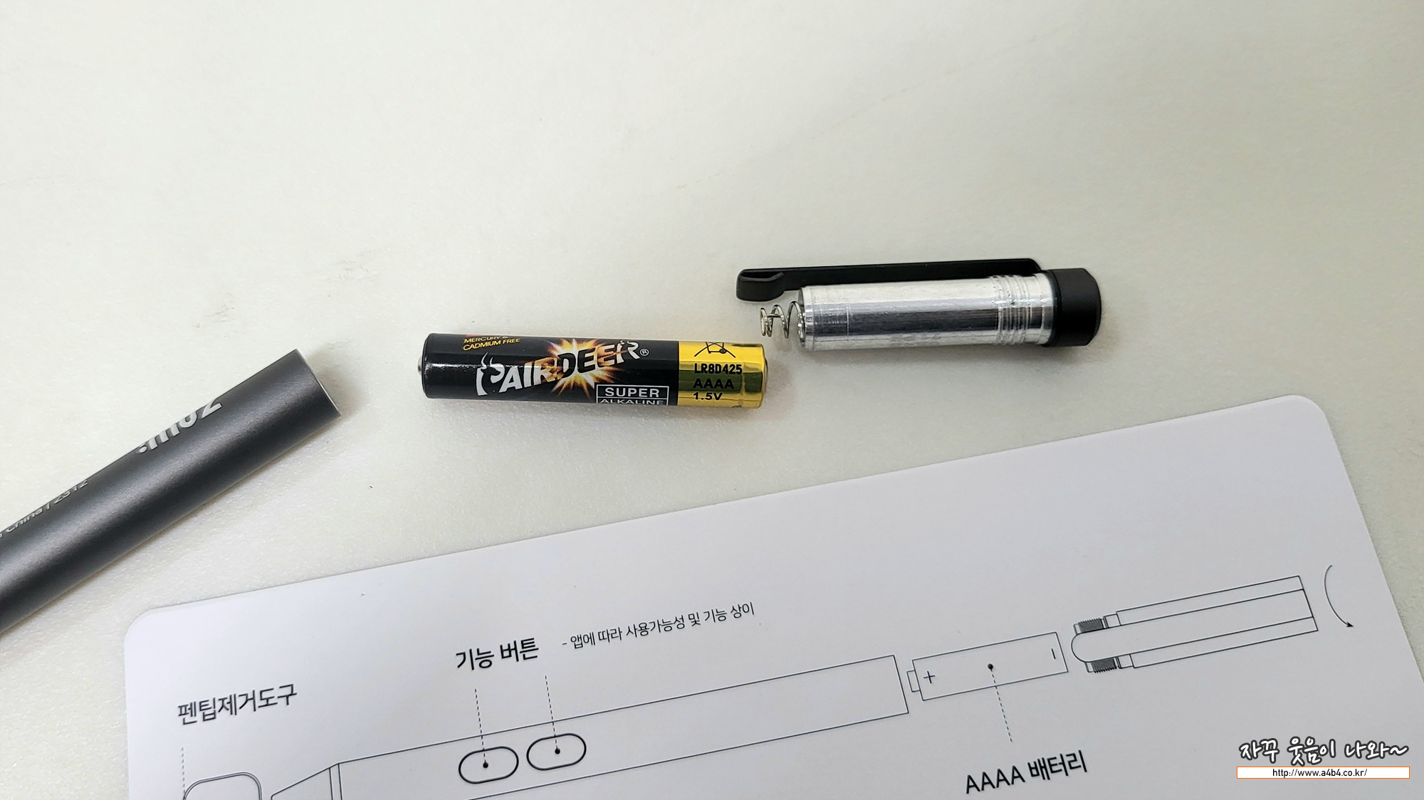 일반적인 태블릿용 저가 스타일러스 펜에서 많이 사용되는 AAAA 배터리 방식의 펜입니다.