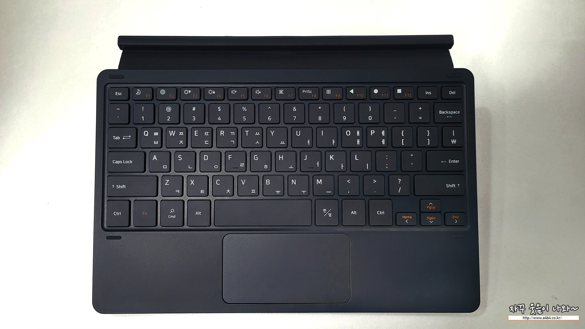 후면 북커더의 경우에도 하드케이스 타입으로 자석식 케이스입니다. 상당히 견고하게 부착되고 뒷부분에 스타일러스펜 수납이 가능한 홈과 태블릿 각도를 조절할 수 있는 힌지가 있습니다. 색상이나 질감 기능은 삼성 갤럭시 태블릿 정품 케이스 키보드와 상당히 유사합니다.