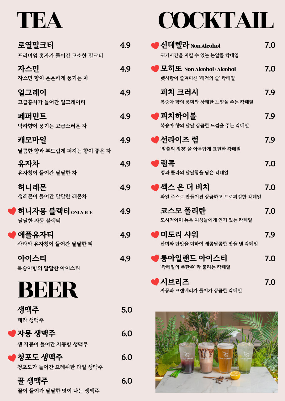 커피, 라떼, 스므디, 쉐이크, 프라페, 에이드와 차 등의 다양한 음료가 준비되어 있습니다. 가격은 5,000원 전후가격을 보입니다. 맥주와 칵테일은 7,000원 전후가격을 보입니다.