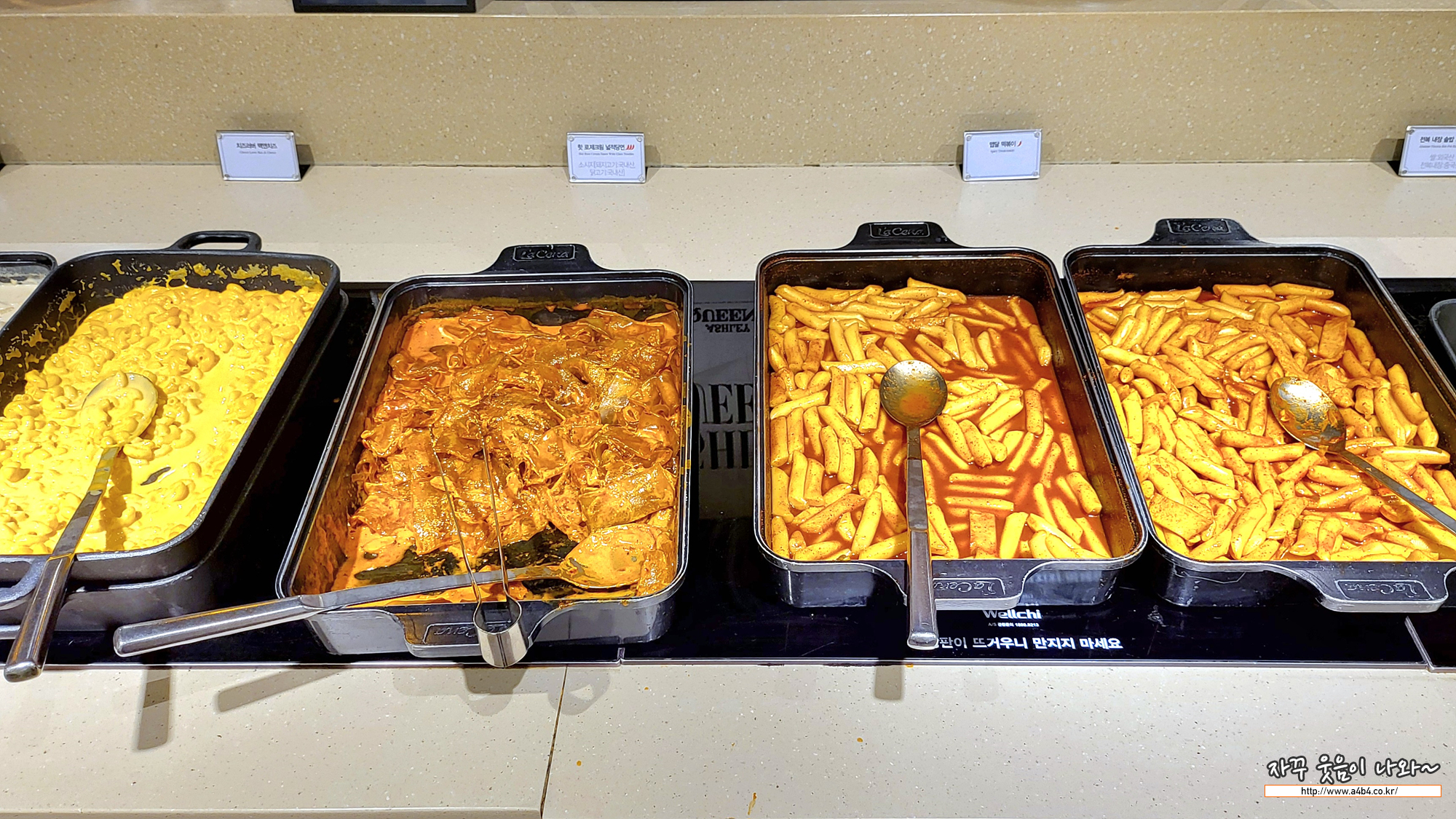 떡볶이가 빠질 수 없죠, 빨간 떡볶이와 크림 떡볶이, 로제 분모자 등이 있고요. 순대나 감자튀김 등의 분식집 메뉴들도 있네요. 이제는 이런 메뉴에 손이 가지 않는데, 아이들은 계속 가지고 옵니다.
