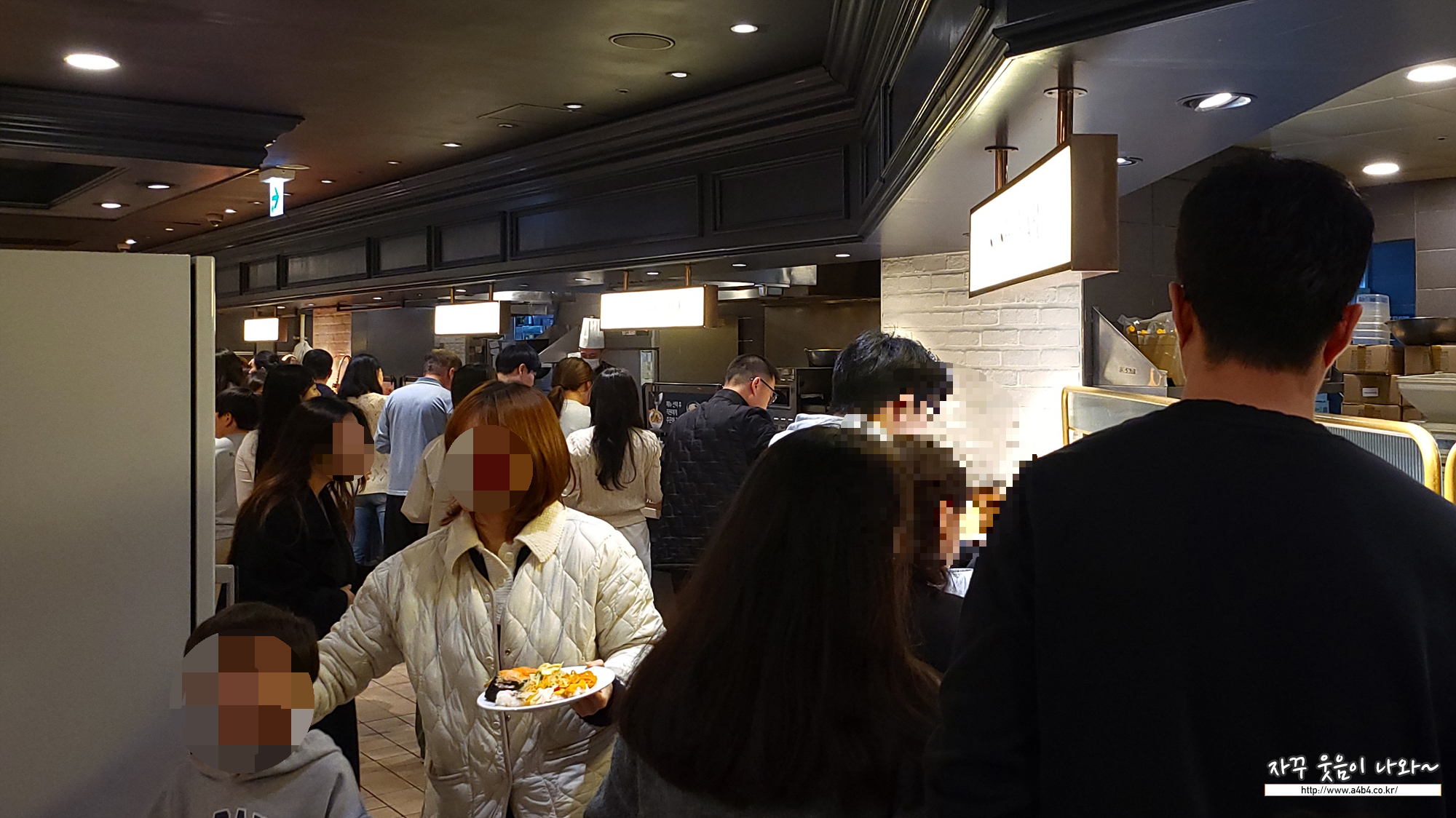 제가 방문한 주말에는 애슐리퀸즈 잠실롯데캐슬점 빈자리가 보이지 않았습니다. 조금 맛난 음식 하나 먹으려면 이렇게 긴 줄도 감당해야 하고요. 입장시에는 식사시간 두 시간 제한이 있을 수 있다는 안내도 받았습니다.