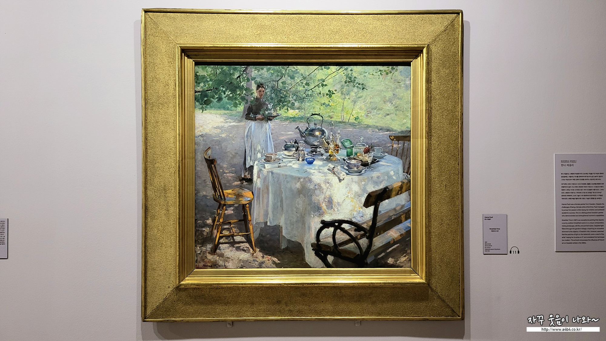 한나 파울리는 파리 유학 시절 동시대 스웨덴 화가들이 모여 있었던 그뢰즈 쉬르 루앙에서 게오르그 파울리를 만나 1887년 에 결혼했습니다. 같은 해 제작된 이 작품은 풍경화, 정물화, 초상화를 혼합한 듯한 색다른 구도 안에서 야외의 아침식사 시간 을 묘사합니다. 정원의 나뭇잎 사이로 드리워진 빛이 식탁 위 정물에 어룽거리고, 아름다운 것들로 가득한 테이블은 가족 혹 은 가정생활을 떠올리게 합니다. 이에 대해 당시 스웨덴의 비평가는 그녀의 기술이 너무나 현대적이라 평가했고, 식탁보에 드 리운 빛 표현에 대해 "붓으로 닦아낸" 흔적이라 추측하기도 했습니다.