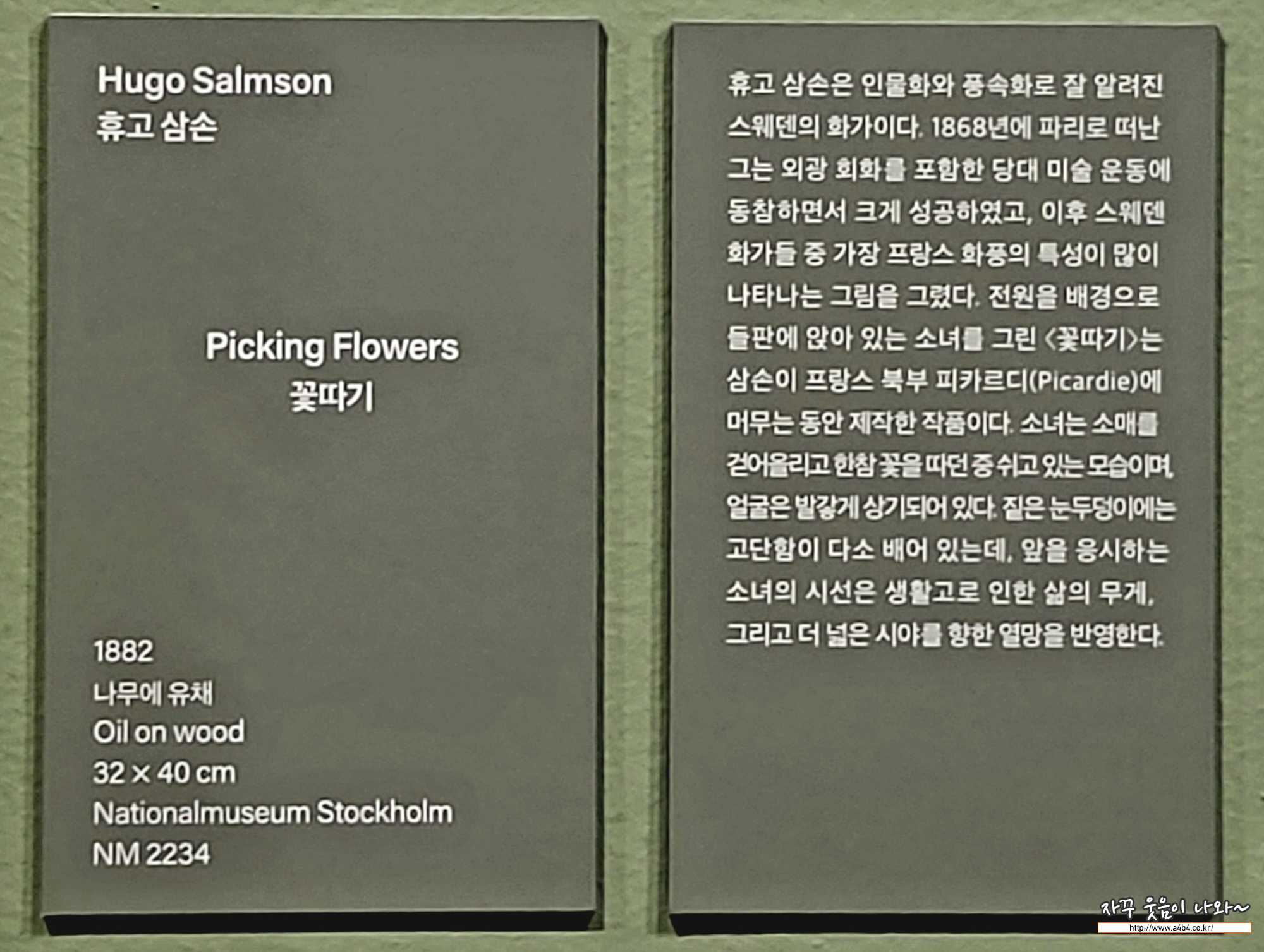 휴고 삼손은 인물화와 풍속화로 잘 알려져 있는 스웨덴의 화가입니다. 외광 회화를 포함한 당대 프랑스 미술에 많은 영향을 받 은 삼손은 스웨덴 화가들 중 가장 프랑스 화풍의 특성이 많이 나타나는 작품을 그린 화가이기도 합니다. 프랑스 북부 피카르 디 지역에 머무르는 동안 그린 이 작품은 자연의 아름다움을 밝고 생동감 있는 색채로 그려내고 있습니다. '들판'이라는 배경 은 프랑스 화가 장 프랑수아 밀레로부터 다루어지면서 프랑스 자연주의 미술의 중심 소재가 되었습니다. 발강게 상기되어 있 는 얼굴의 소녀는 소매를 걷어올리고 한참 꽃을 따다 쉬고 있는 모습입니다. 짙은 눈두덩이에는 고단함이 다소 배어있으며, 시 선은 생활고로 인한 삶의 무게, 그리고 더 넓은 시야를 향한 열망을 반영하고 있습니다.