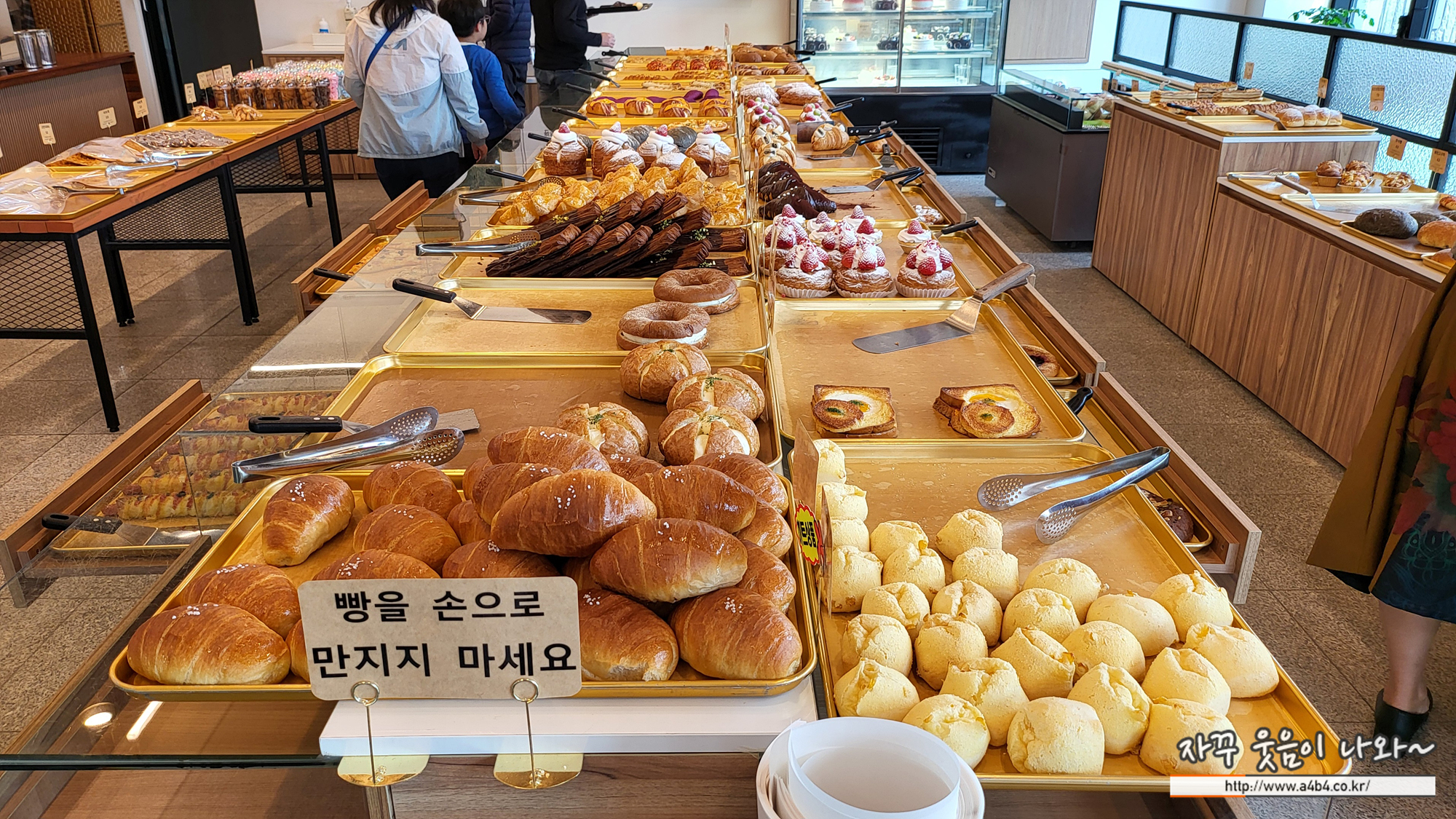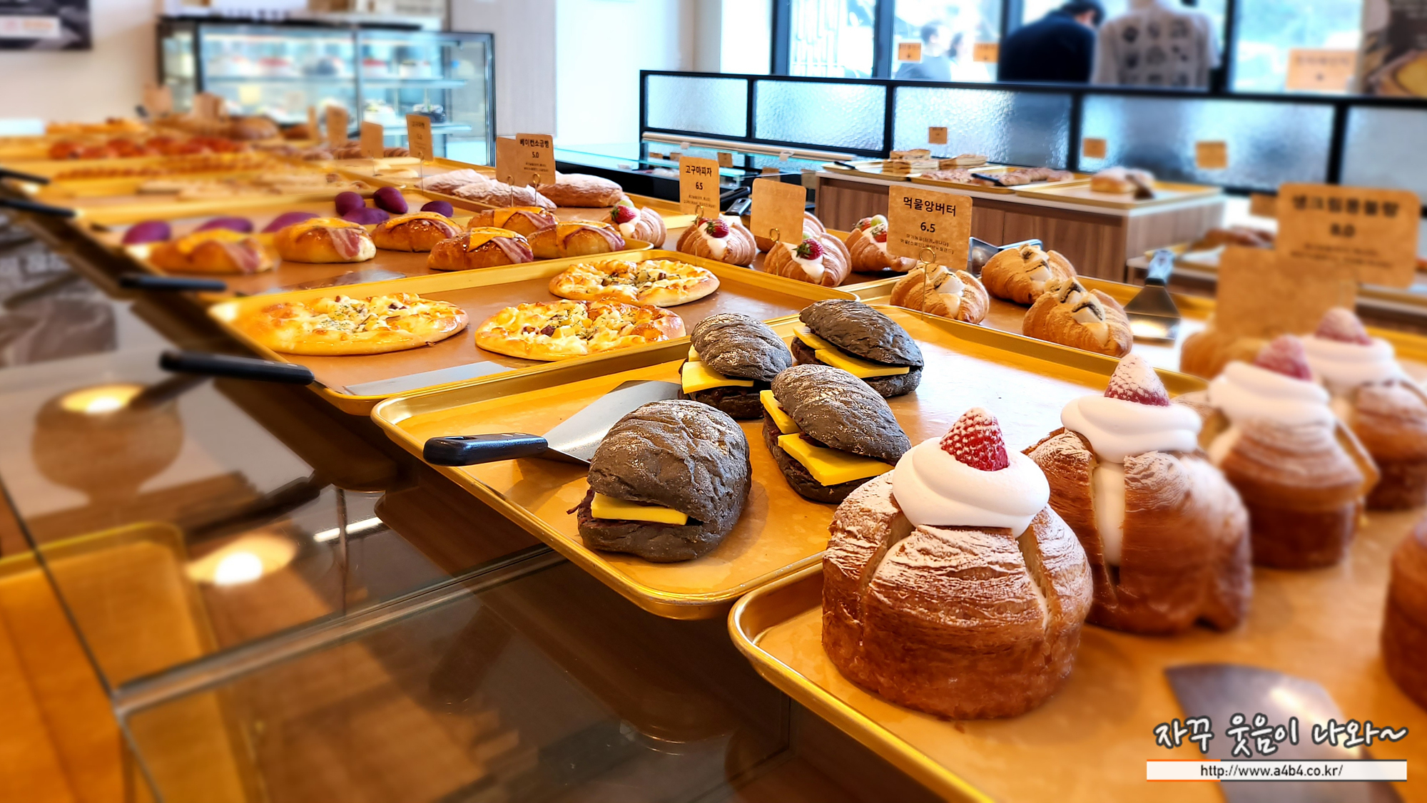 일반적인 빵집과 같이 다양한 빵들이 전시되어 있고요. 이곳에서 마음에 드는 빵을 고르고 카운터에서 계산 후 식사하시면 됩니다.