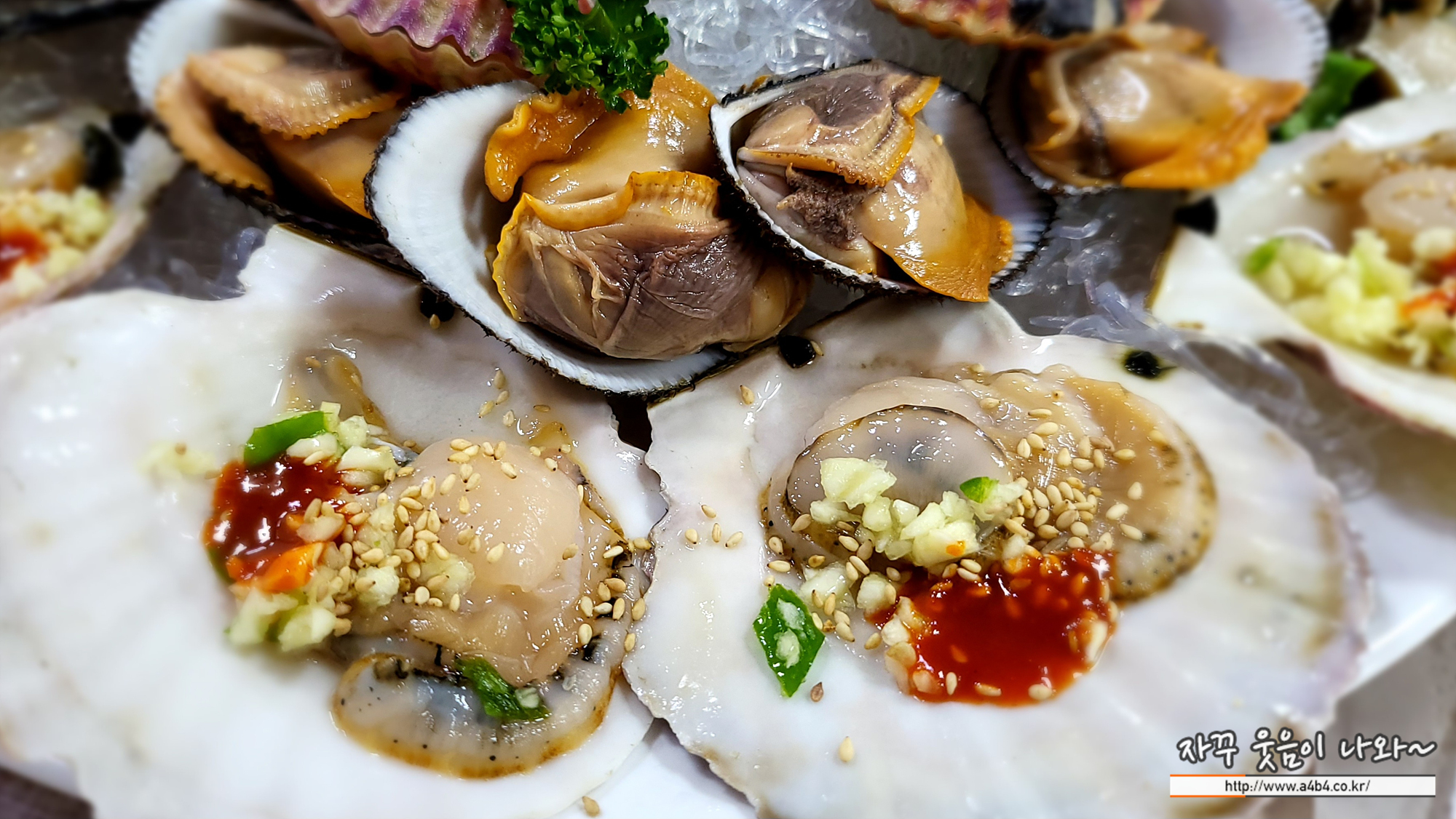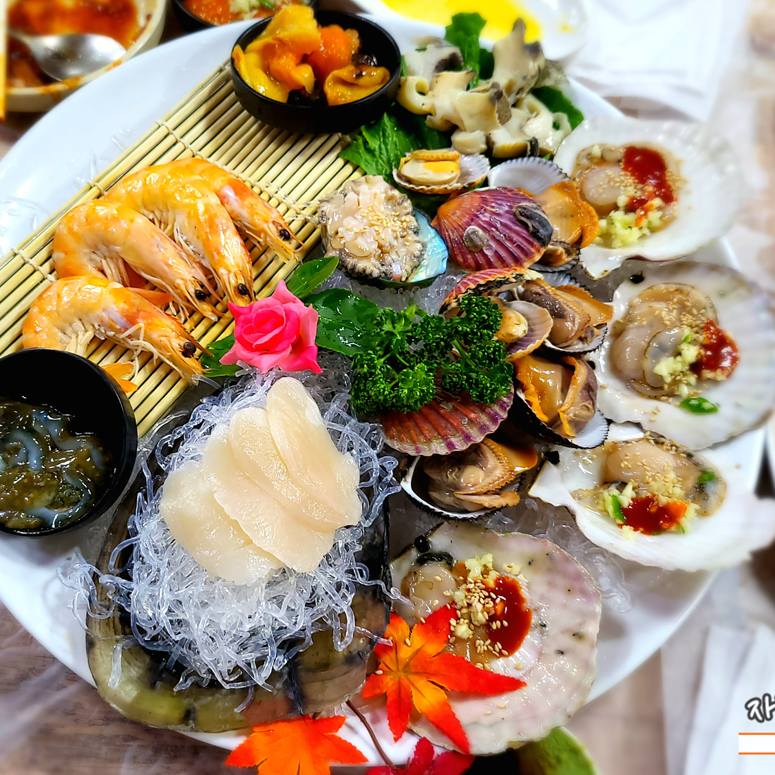 관자나, 가리비, 전복은 생으로 소라나 꼬막, 새우 등은 삷은 요리로 나왔네요.