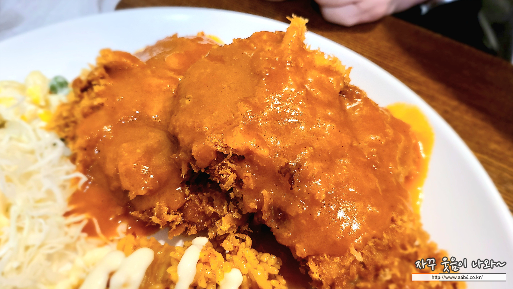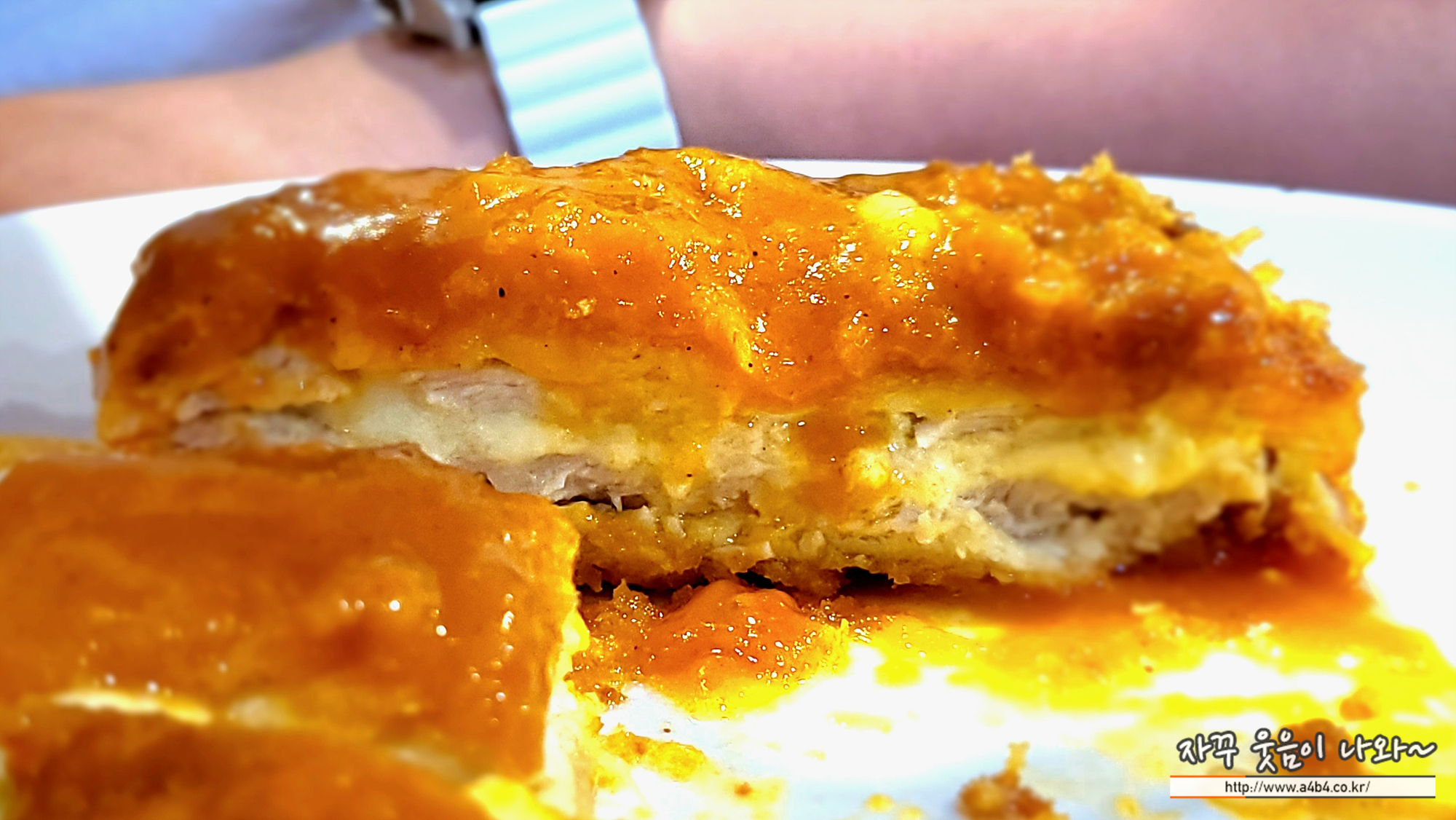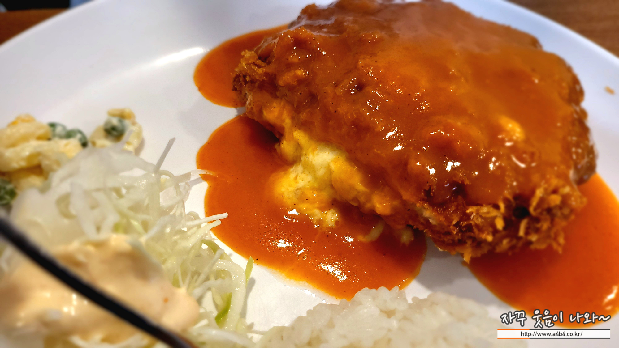 사진과 같이 따뜻한 치즈름 듬쁙 머금은 돈까스가 나왔습니다. 고소한 맛의 치즈 돈까스도 좋은 선택중 하나!