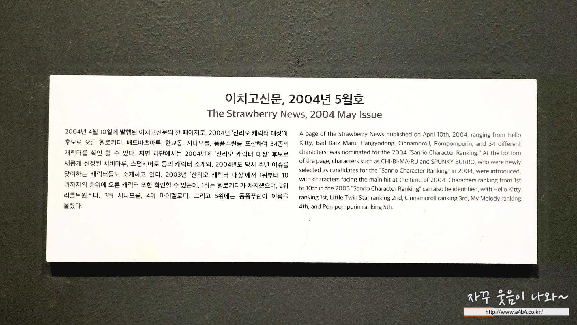 2004년 4월 10일에 발행된 이치고신문의 한 페이지로, 2004년 '산리오 캐릭터 대상'에 후보로 오른 헬로키티, 배드바츠마루, 한교동, 시나모롤, 폼폼푸린를 포함하여 34종의 캐릭터를 확인 할 수 있다. 지면 하단에서는 2004년에 '산리오 캐릭터 대상' 후보로 새롭게 선정된 치비마루, 스펑키버로 등의 캐릭터 소개와, 2004년도 당시 주년 이슈를 맞이하는 캐릭터들도 소개하고 있다. 2003년 '산리오 캐릭터 대상'에서 1위부터 10 위까지의 순위에 오른 캐릭터 또한 확인할 수 있는데, 1위는 헬로키티가 차지했으며, 2위 리틀트윈스타, 3위 시나모롤, 4위 마이멜로디, 그리고 5위에는 폼폼푸린이 이름을 올렸다.