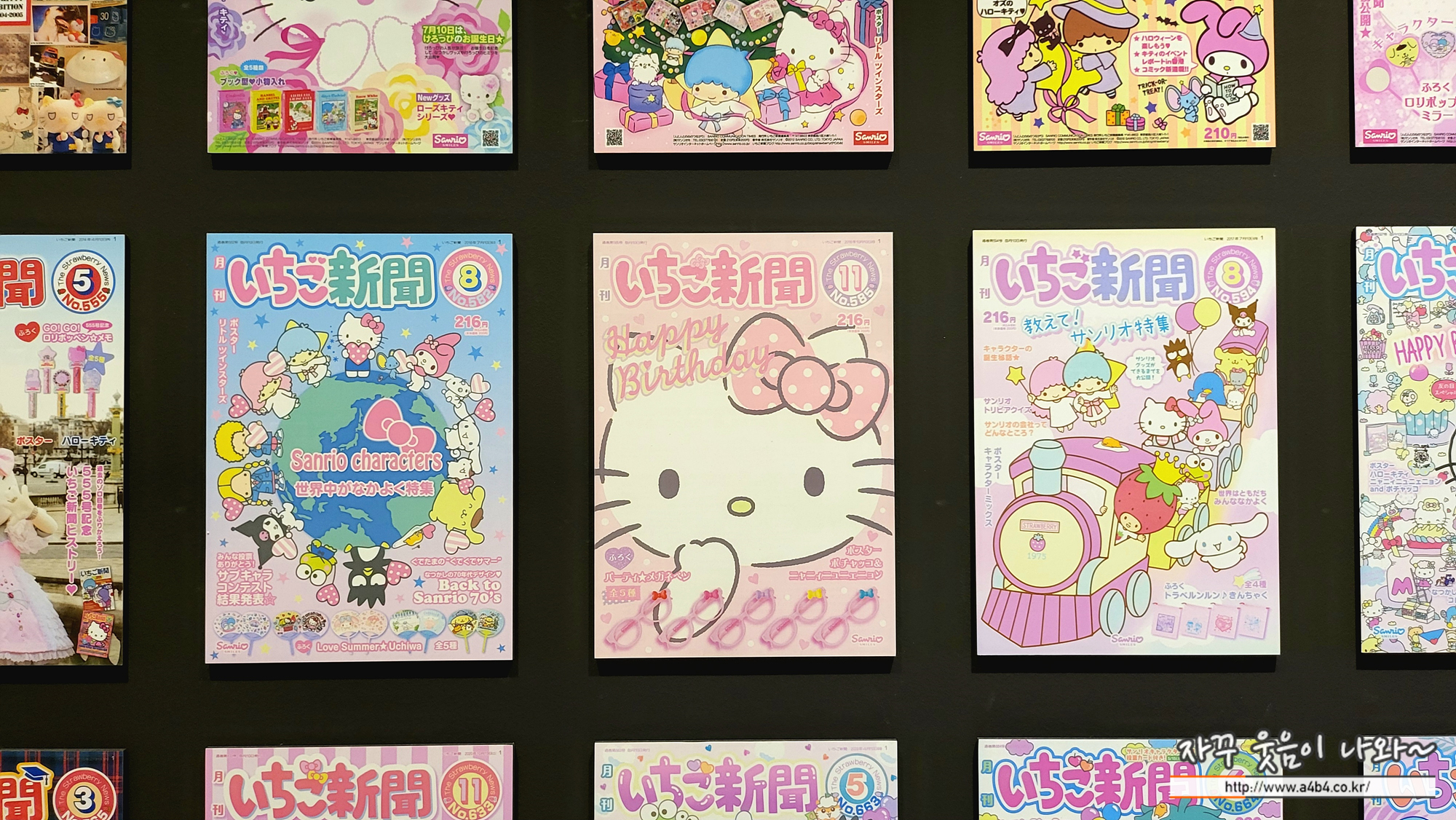 대략 이런 느낌의 방과 산리오의 캐릭터 이미지와 인형, 다양한 상품과 소개등이 구역별로 나뉘어 전시되고 있습니다.
