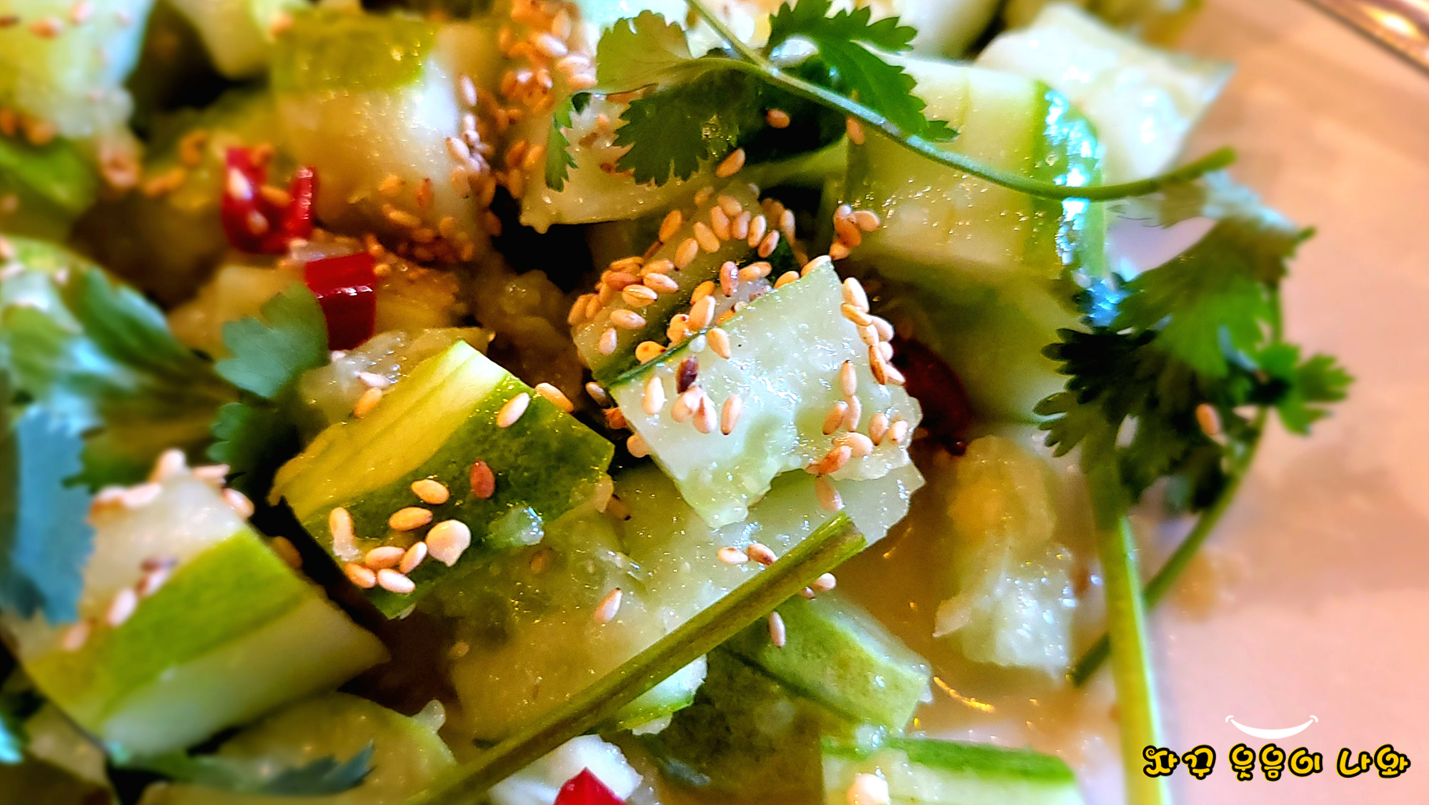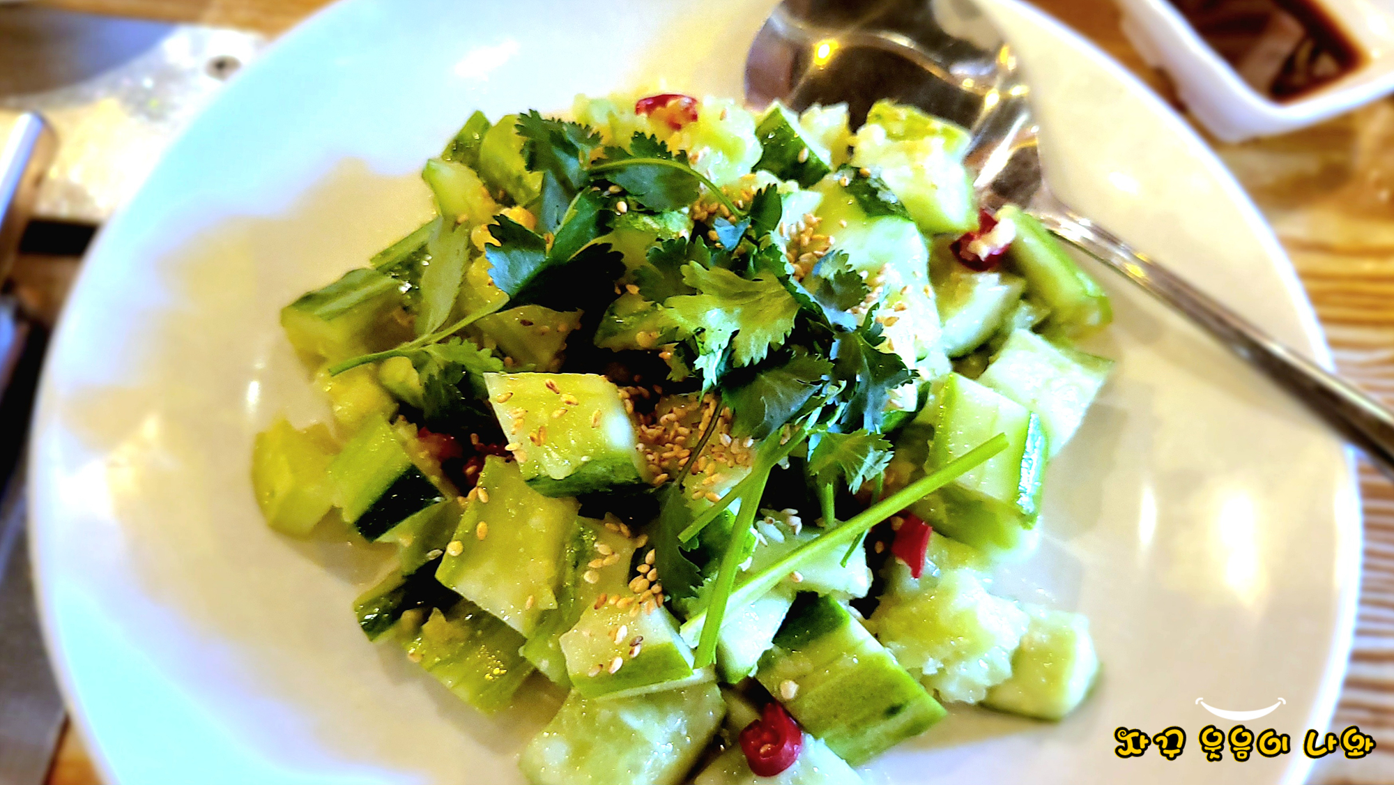 제가 잠실 한성양꼬치나 다은 양꼬치 전문점에서 꼭 마무리로 주문하는 메뉴 중 하나가 바로 오이무침입니다. 생오이에 소금과 참기름 깨소금 등을 넣고 버무린 것에 고수가 살짝 올라간 메뉴인데요.