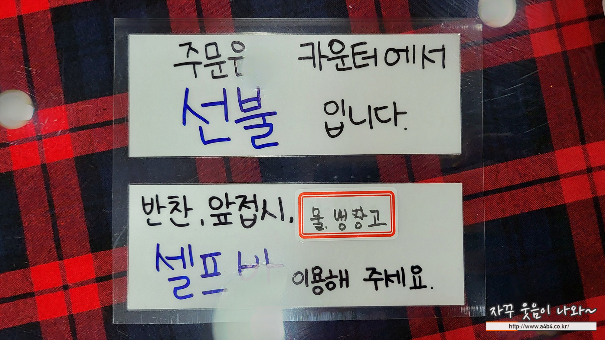 메뉴판에서 주문할 메뉴를 선택하고 홀에 위치한 카운터에서 선불결제 하시면 됩니다.