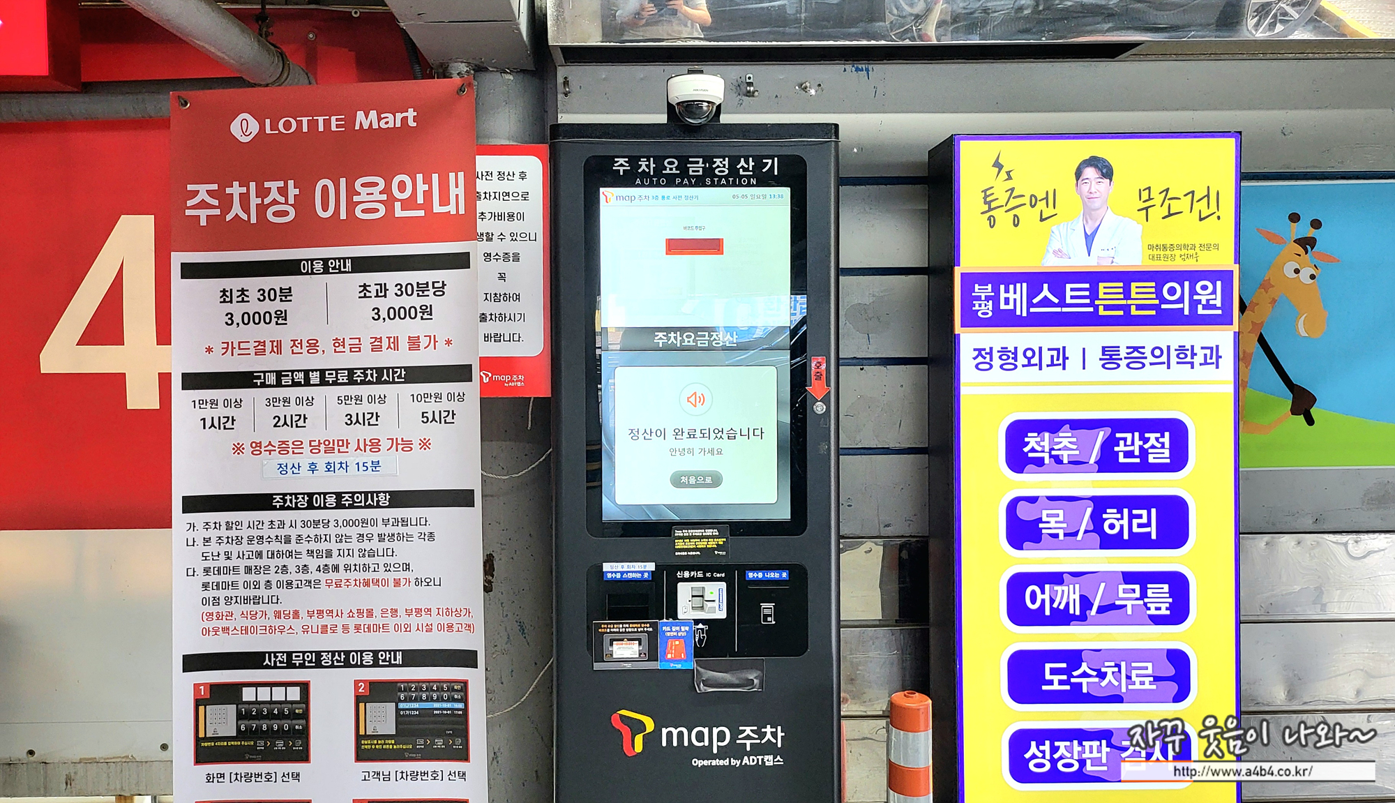 정산은 주차장 무인 정산기를 잉요하면 되고요. 영수증 바코드를 인식하면 자동정산 됩니다.