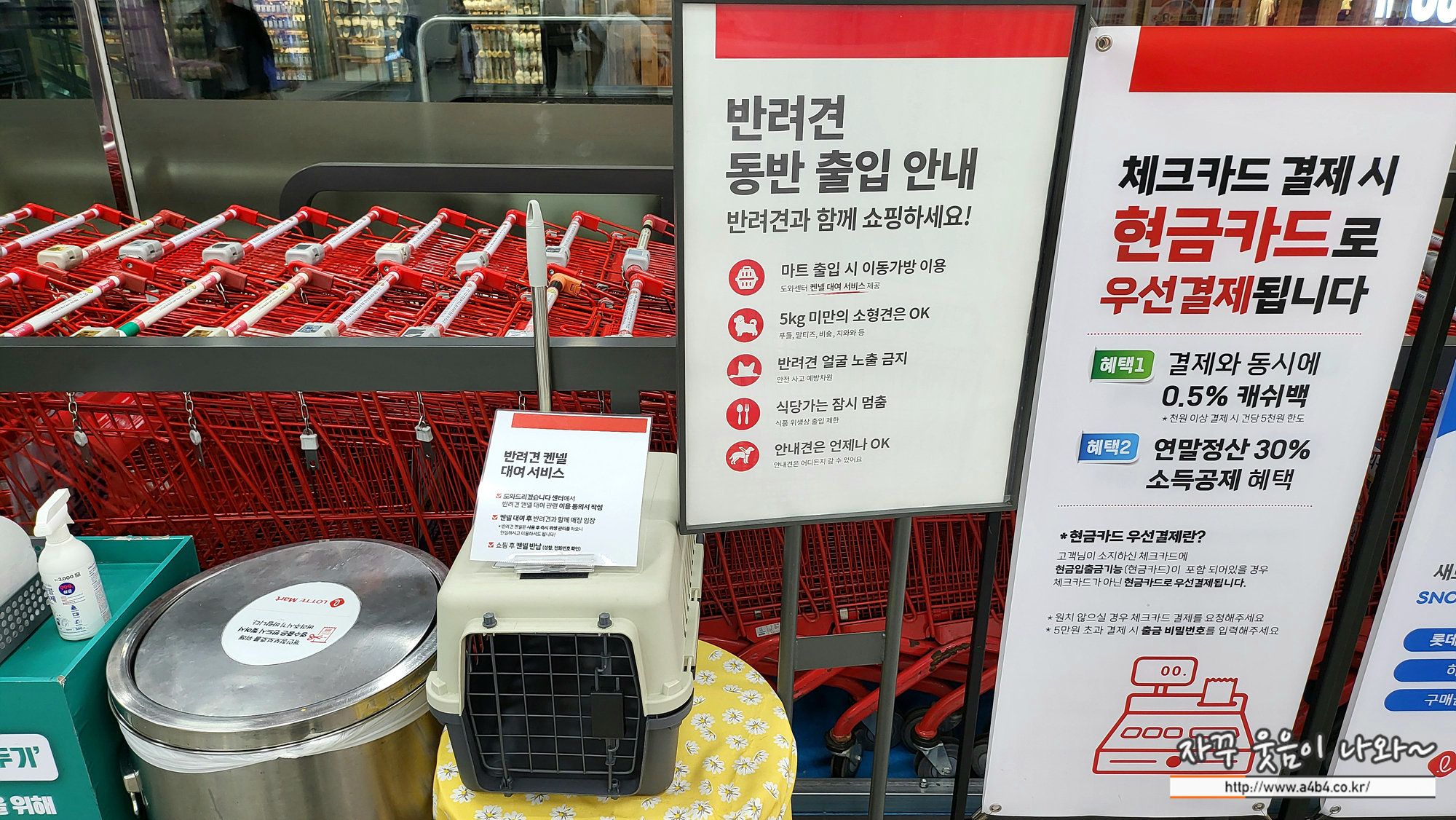 과거 롯데마트에서 시각장애인 안내견 입장을 거부하다 언론에서 탈탈 털린 이후로 반려동물 출입이 가능해진 곳입니다. 물론 캐이지나 캐리어 이용필수이며, 음식을 판매하다 보니, 강아지가 캐리어 밖으로 나오면 안됩니다.