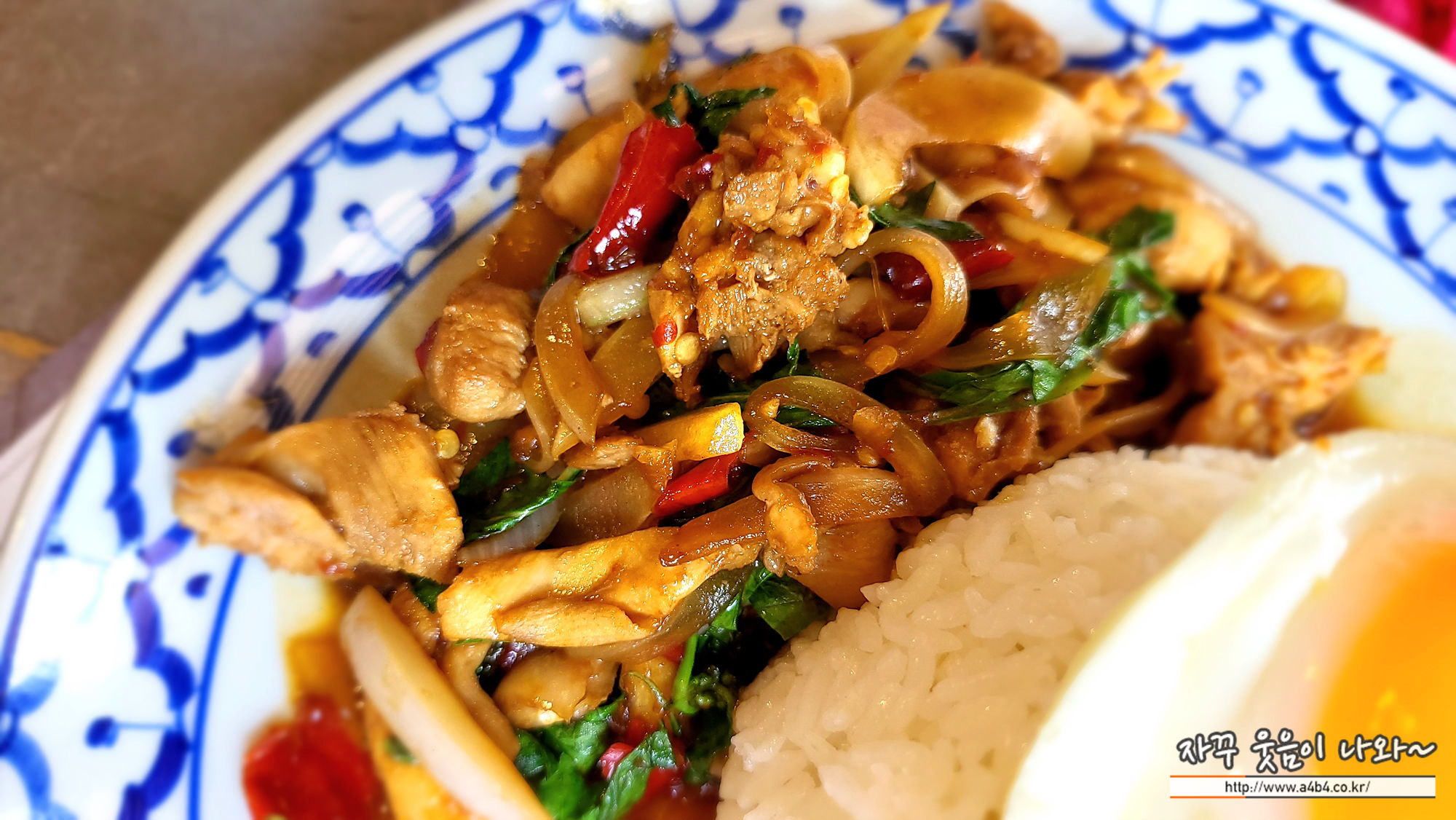 바질 잎을 곁들인 매콤한 치킨밥으로 맵기는 아주 약간 매운맛을 보입니다.