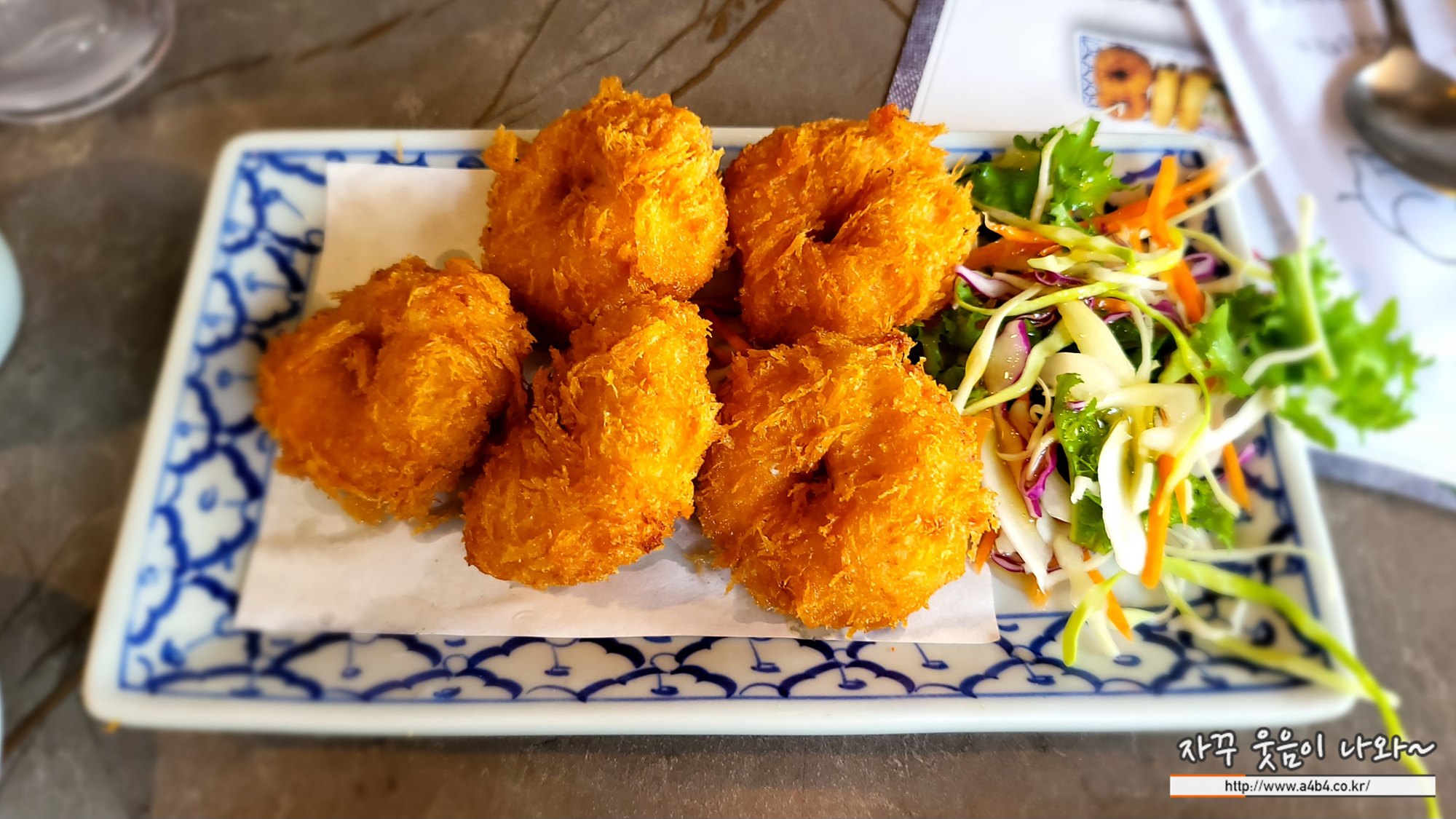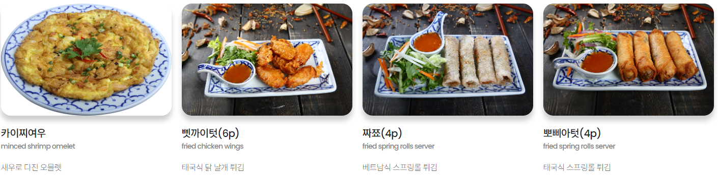 다진 새우로 만든 튀김으로 저는 항상 태국음식점에 오면 주문하는 메뉴 중 하나입니다. 달콤고소하다고 할까요? 다진 새우살의 식감과 육즘, 그리고 칠리소스의 조화가 매력적인 사이드메뉴 입니다. 엄청 뜨거우니 드실 때 조심하세요.