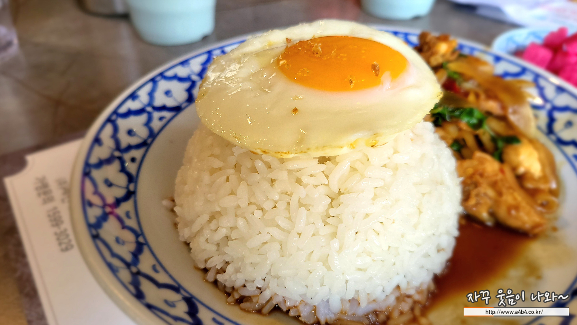 밥은 아주 큰 공깃밥 하나가 나오네요. 그 위에 계란프라이 하나 올라가 있습니다.