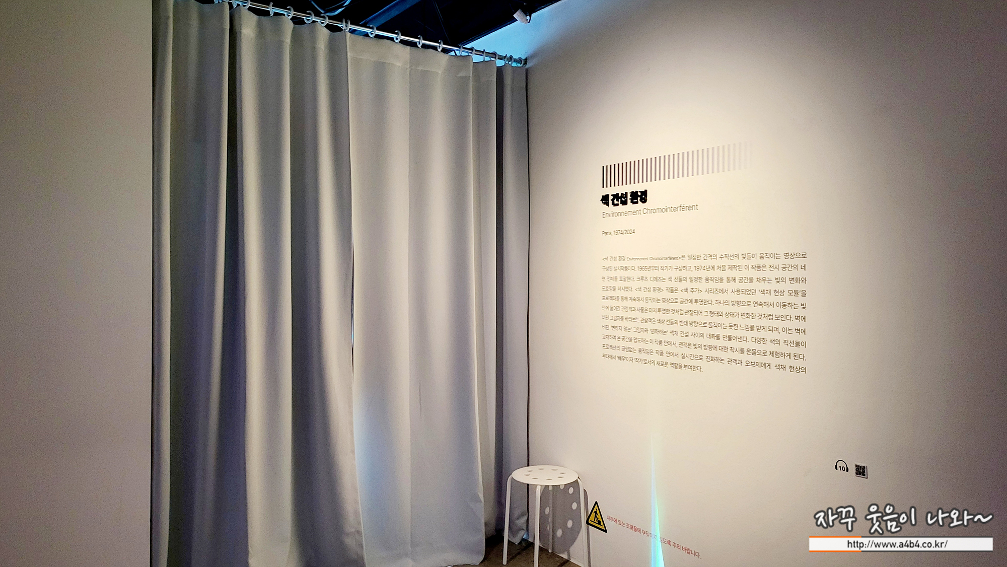 처음 들어왔을 때 느낀 빨간색이 어떻게 변했나요? 점차 색이 열어지고 흰 벽이 느껴지기 시작할 것입니다. 시각의 안정화 과정은 사람마다 시간이나 정도가 다르니 천천히 느껴보세요