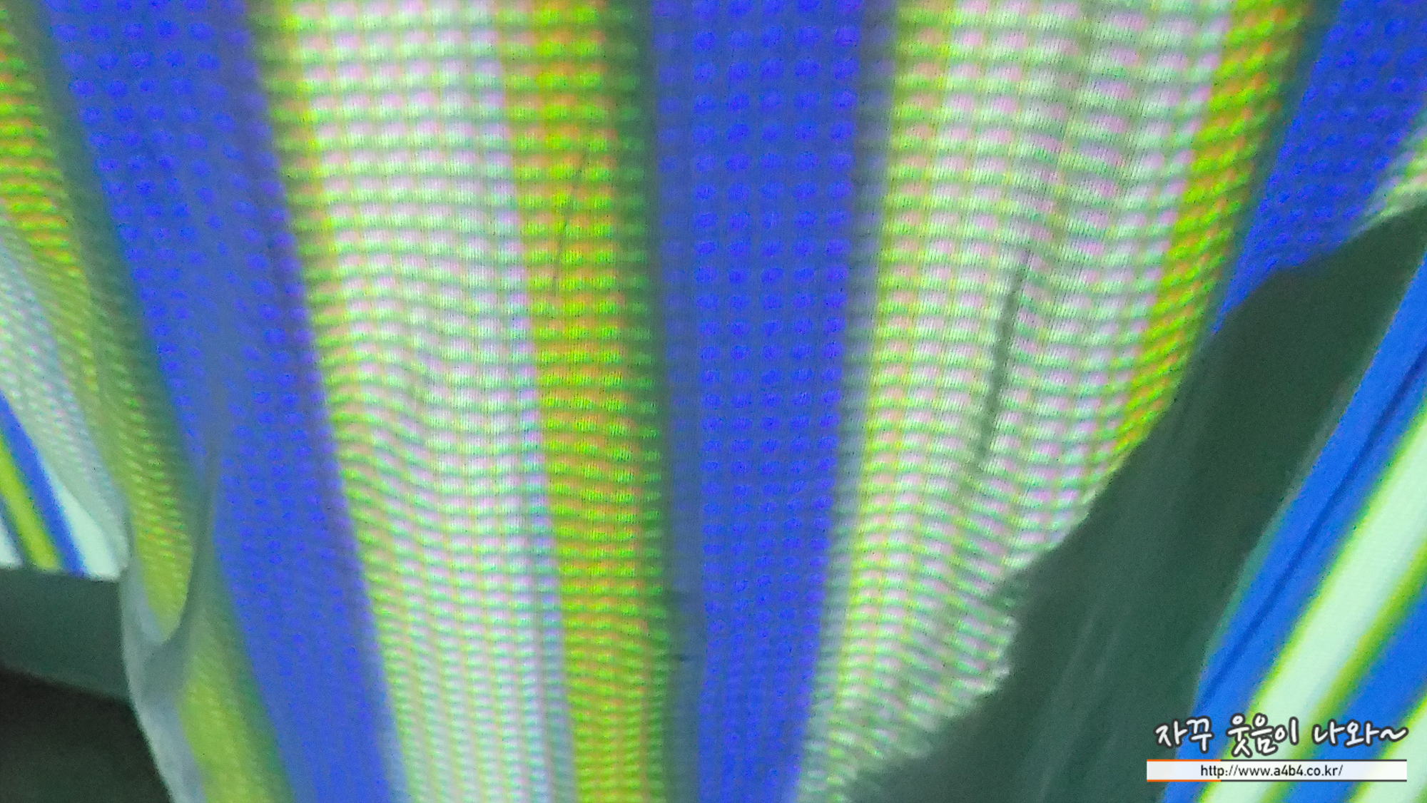 멀리서 보았던 무지개빛 스펙트럼이 사라지고 화면엔 검은 선만 존재하는 것을 확인할 수 있습니다. 작품에 반복되고 있는 세가지 색 선들에서 반사하고 있는 이 작품속 모둘들에 검은 선 하나가 비스듬히 추가되면서, 빛의 반사 현상을 부분적으로 변동시키게 됩니다. 검은 색은 모든 빛을 흡수해 버리고, 서로 맞닿는 두 가지 색조의 조합을 끊어버리게 되는데, 이때 반사되는 빛의 조합이 달라지게 되어 나타나는 협상을 작품에 반영한 것입니다.
