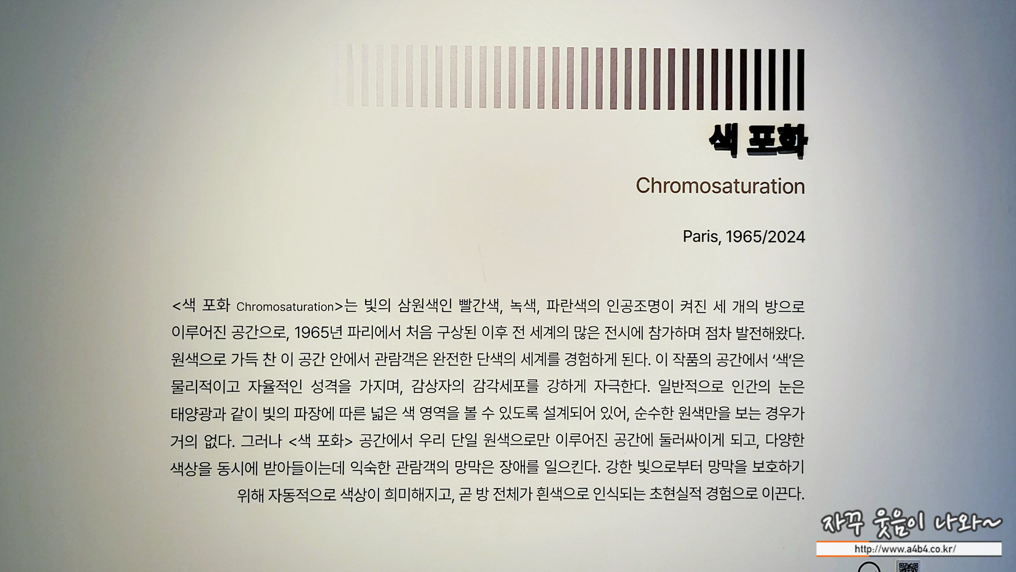 '색 포화 Chromosaturation' 는 빛의 삼원색인 빨간색, 녹색, 파란색의 인공조명이 켜진 세 개의 방으로 이루어진 공간으로, 1965년 파리에서 처음 구상된 이후 전 세계의 많은 전시에 참가하며 점차 발전해왔다고 합니다. 원색으로 가득 찬 이 공간 안에서 관람객은 완전한 단색의 세계를 경험하게 되는데요.